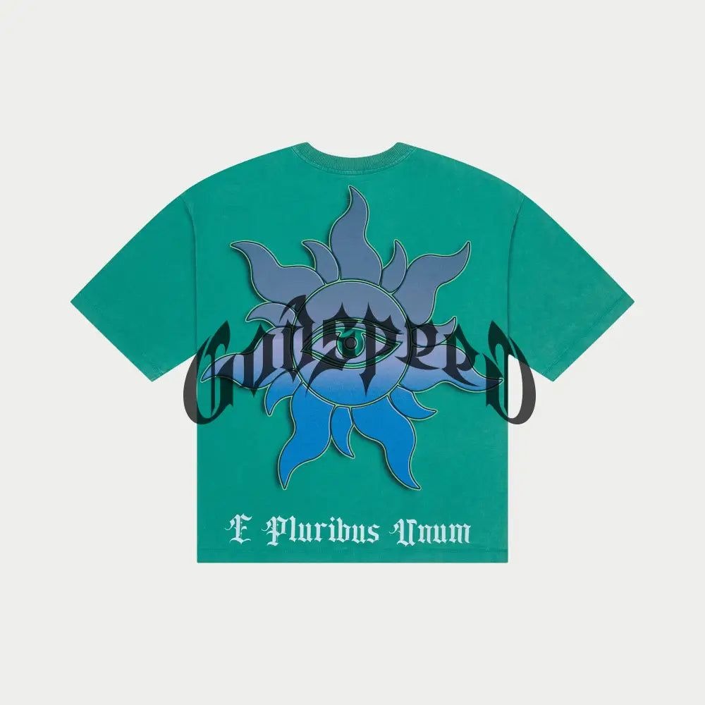 Elevate your casual wardrobe with the GODSPEED U.A.P Tee Shirt. This sophisticated crew neck features captivating artwork on both front and back, rendered in a distinctive Green Royal Wash colorway. Crafted from substantial 10oz mid-weight washed fabric, it offers refined comfort with a straight hem for a clean silhouette. A thoughtful balance of artistic expression and premium construction.