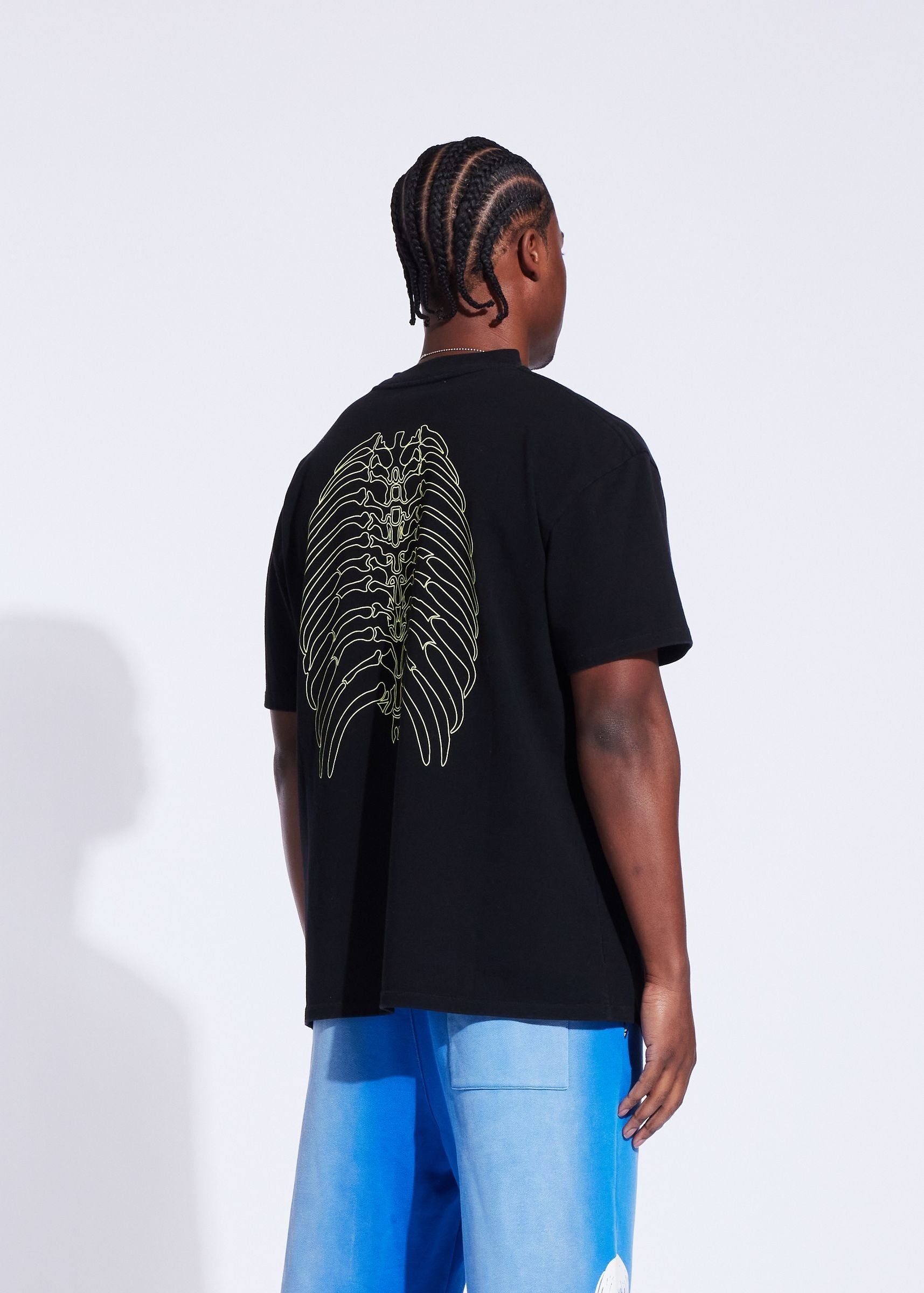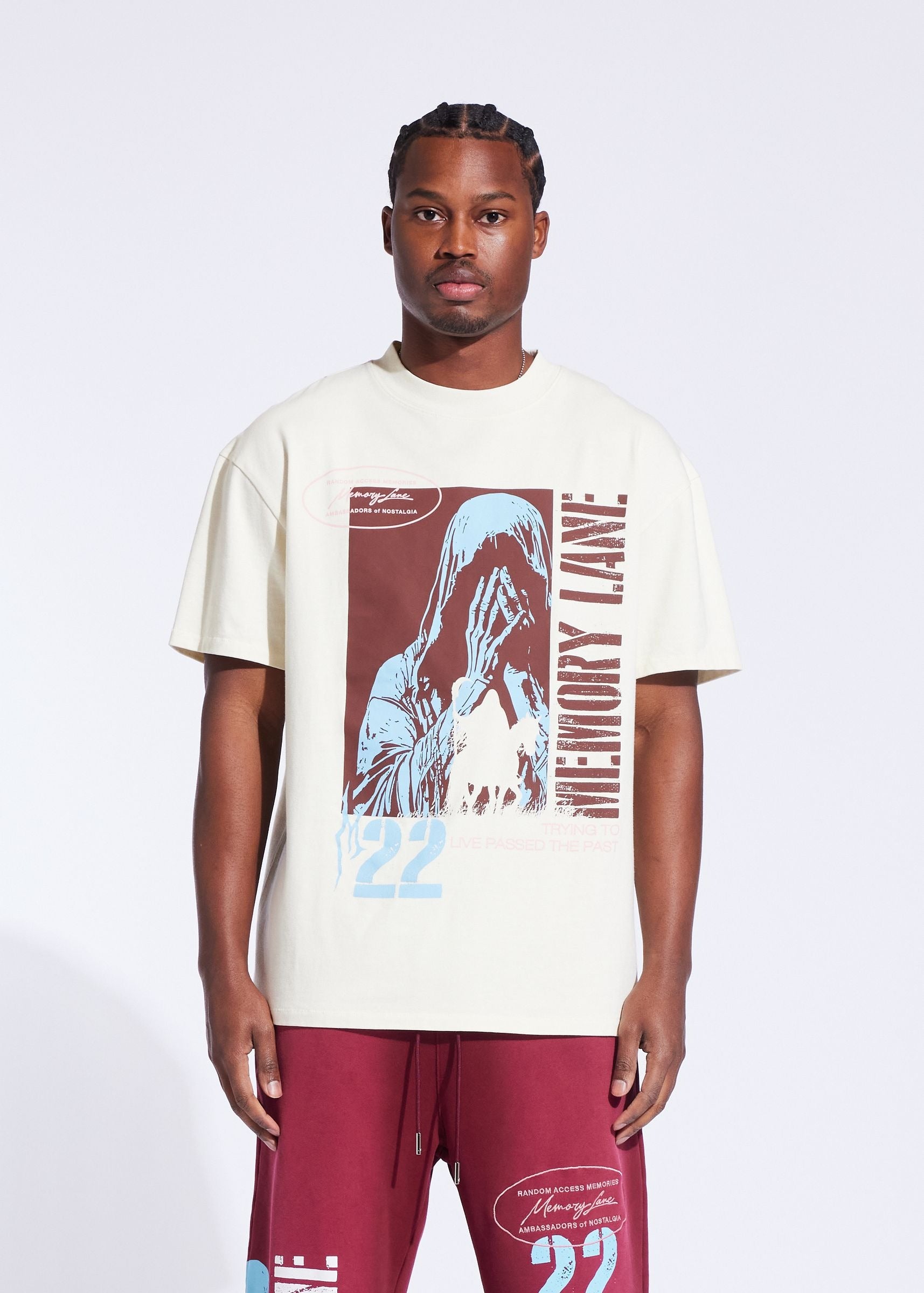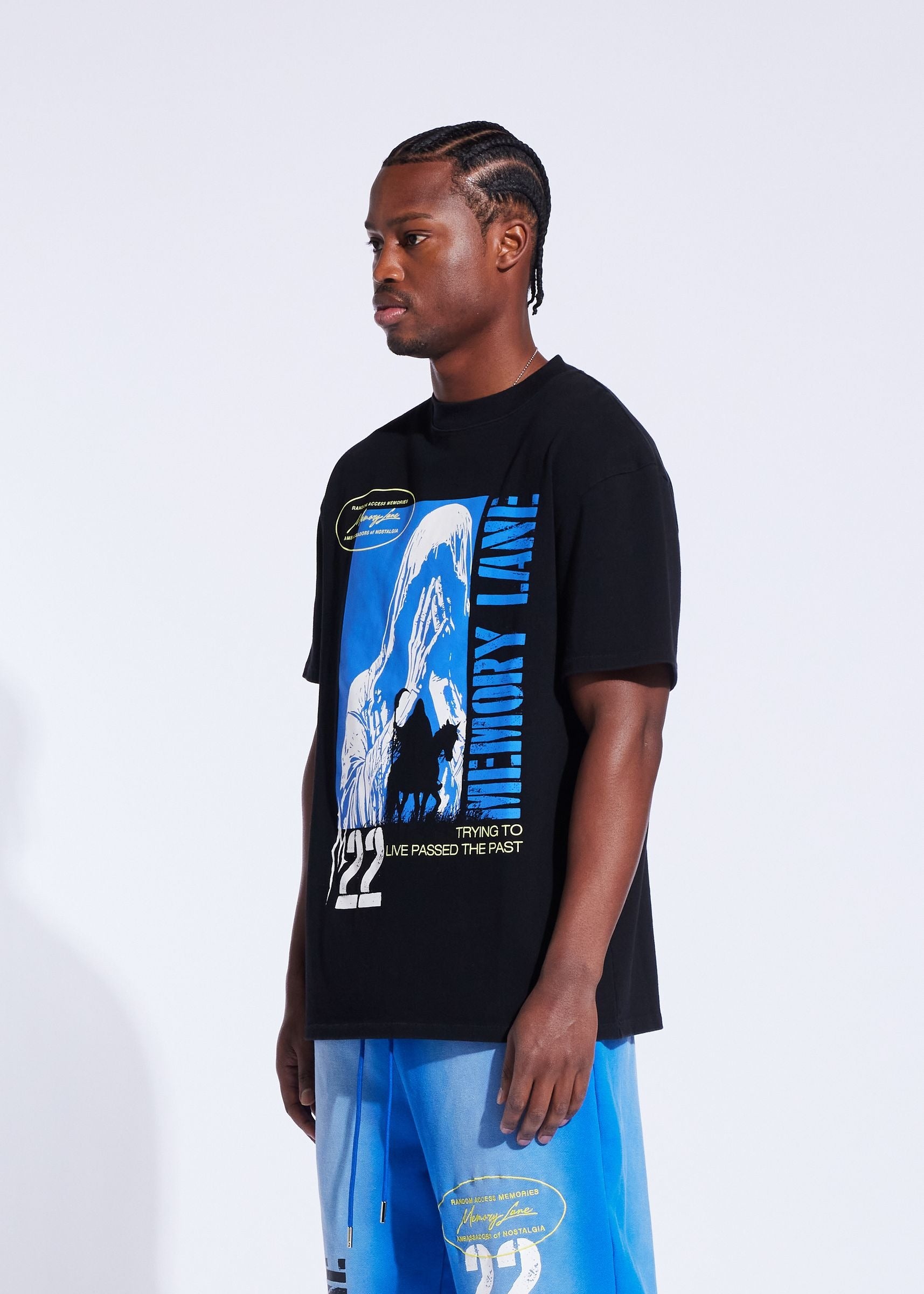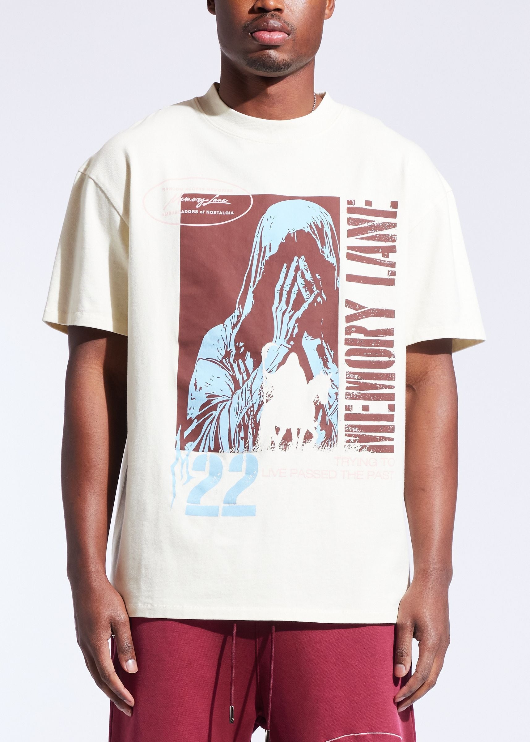 The Memory Lane Tee Shirt in the Runnin' Past style combines premium 100% cotton jersey fabric with a substantial 300 GSM weight for lasting comfort and durability. Its regular fit and vintage wash provide a timeless look, while the oversized front and back prints add distinctive style. Perfect for those seeking a high-quality, classic tee that pairs well with any casual outfit.