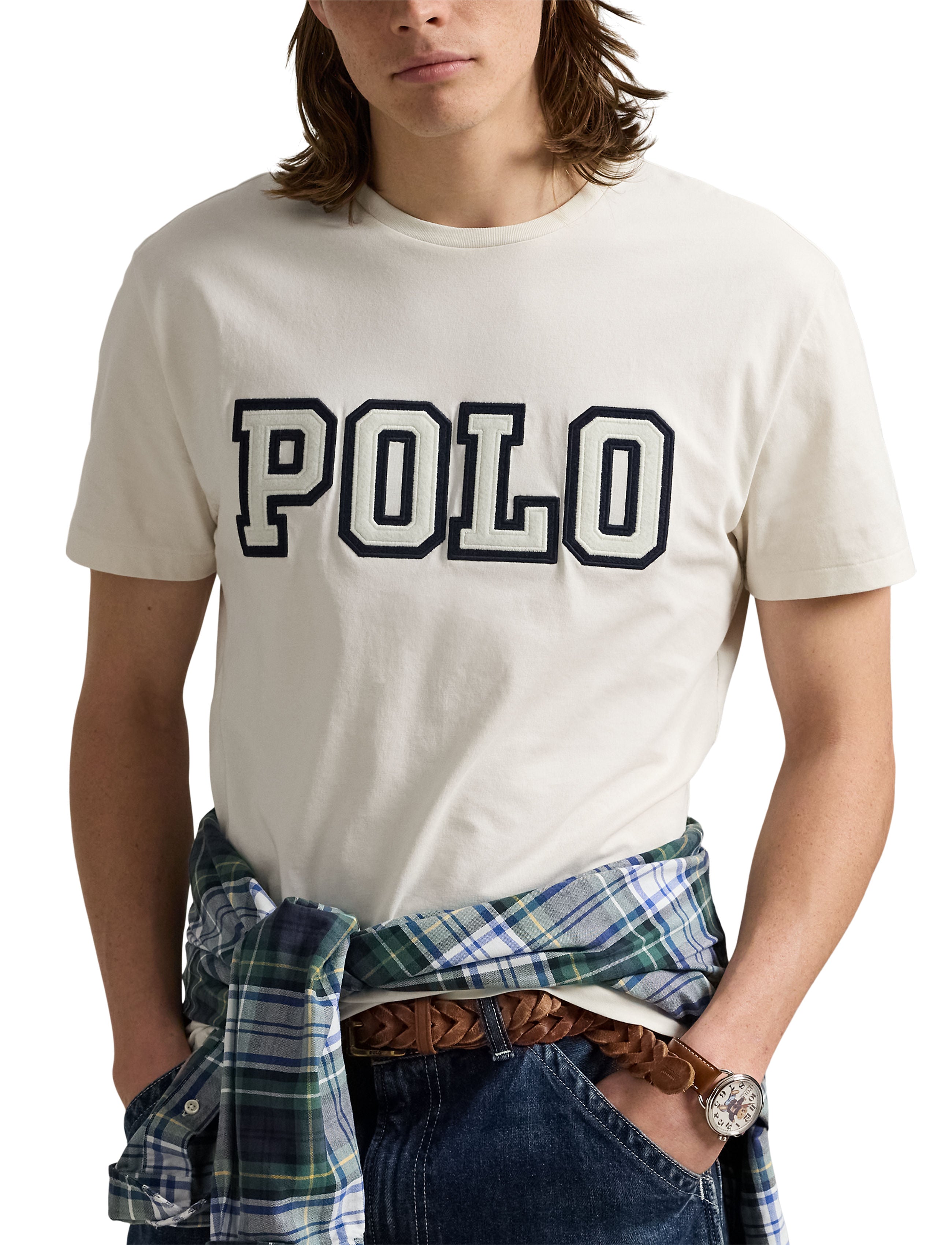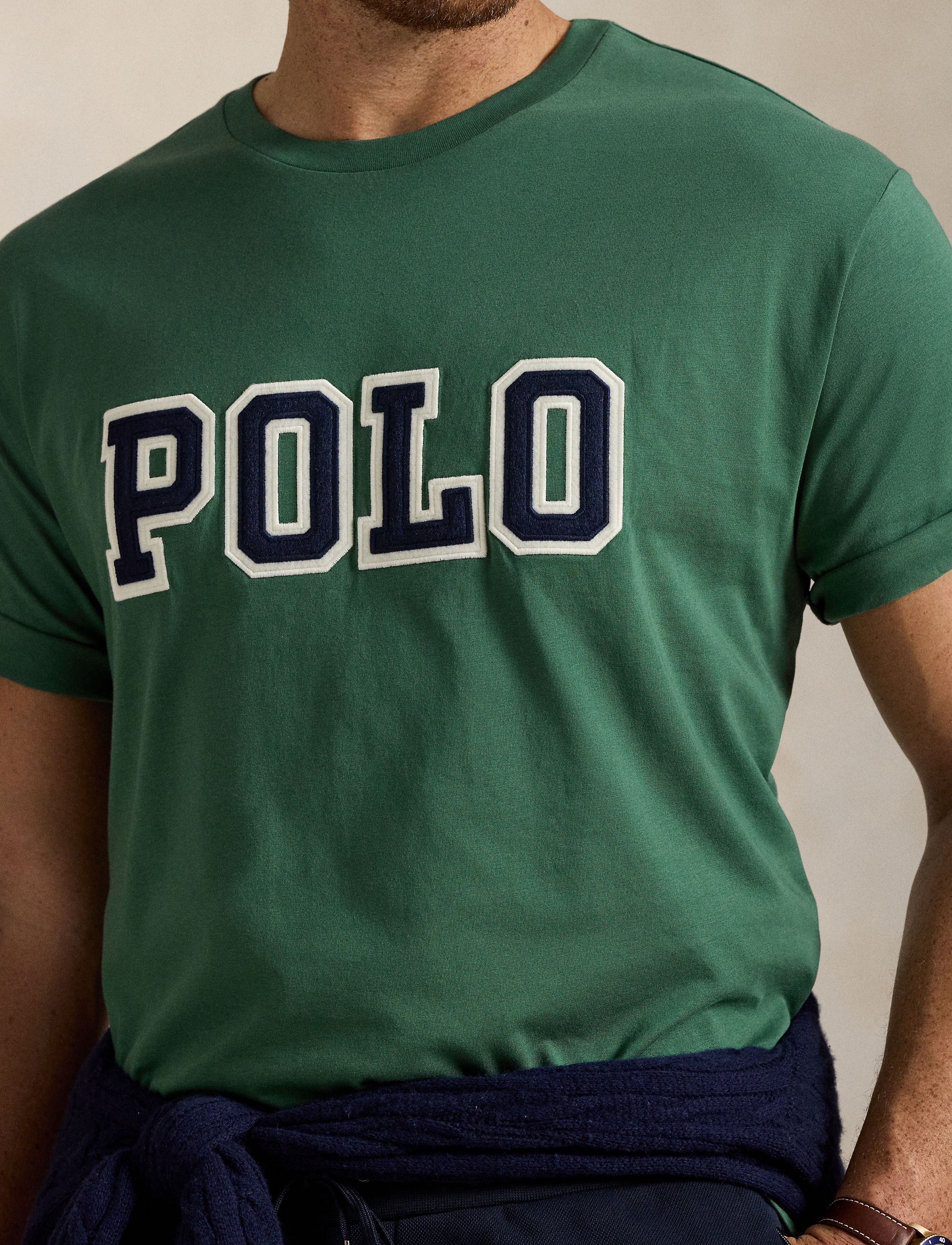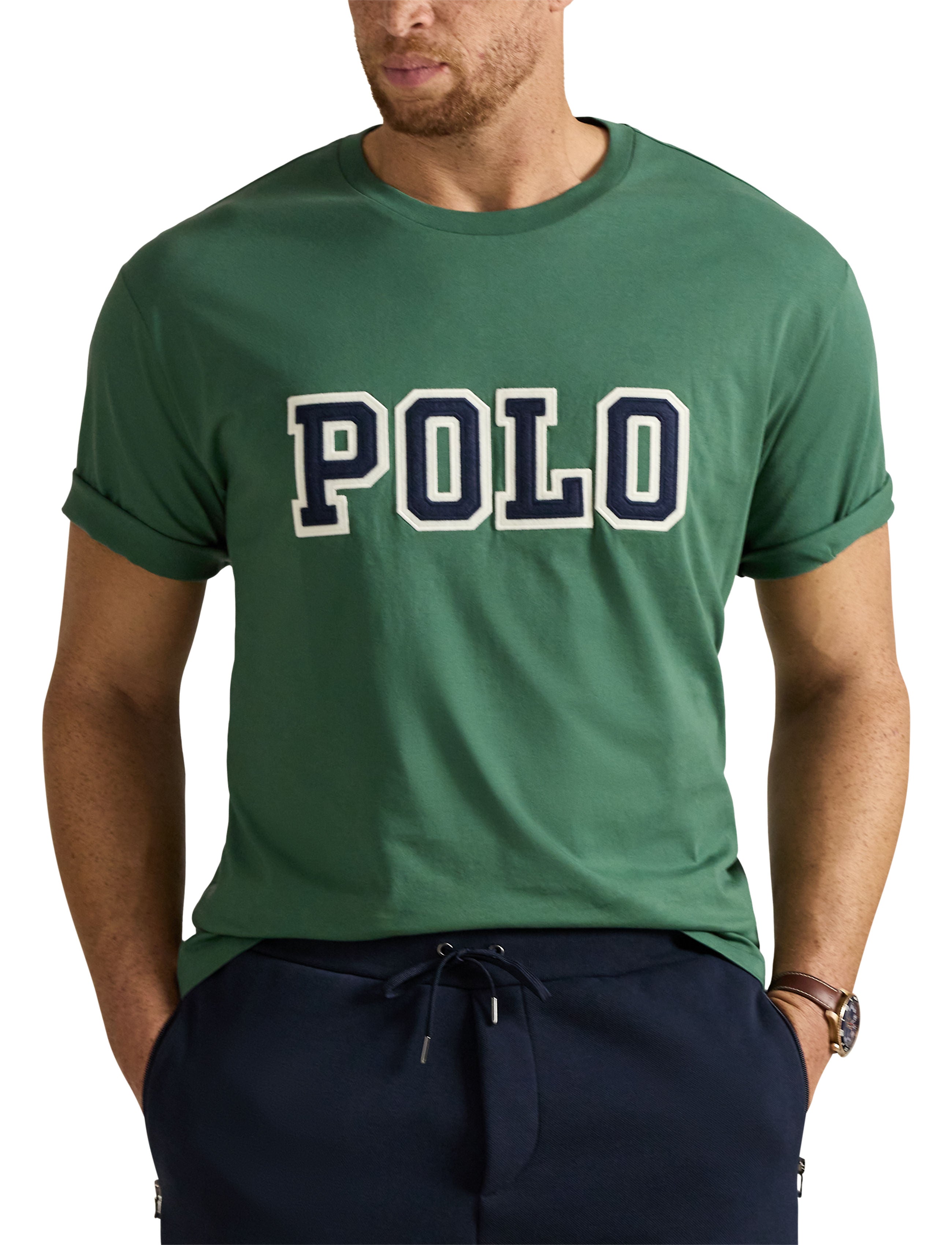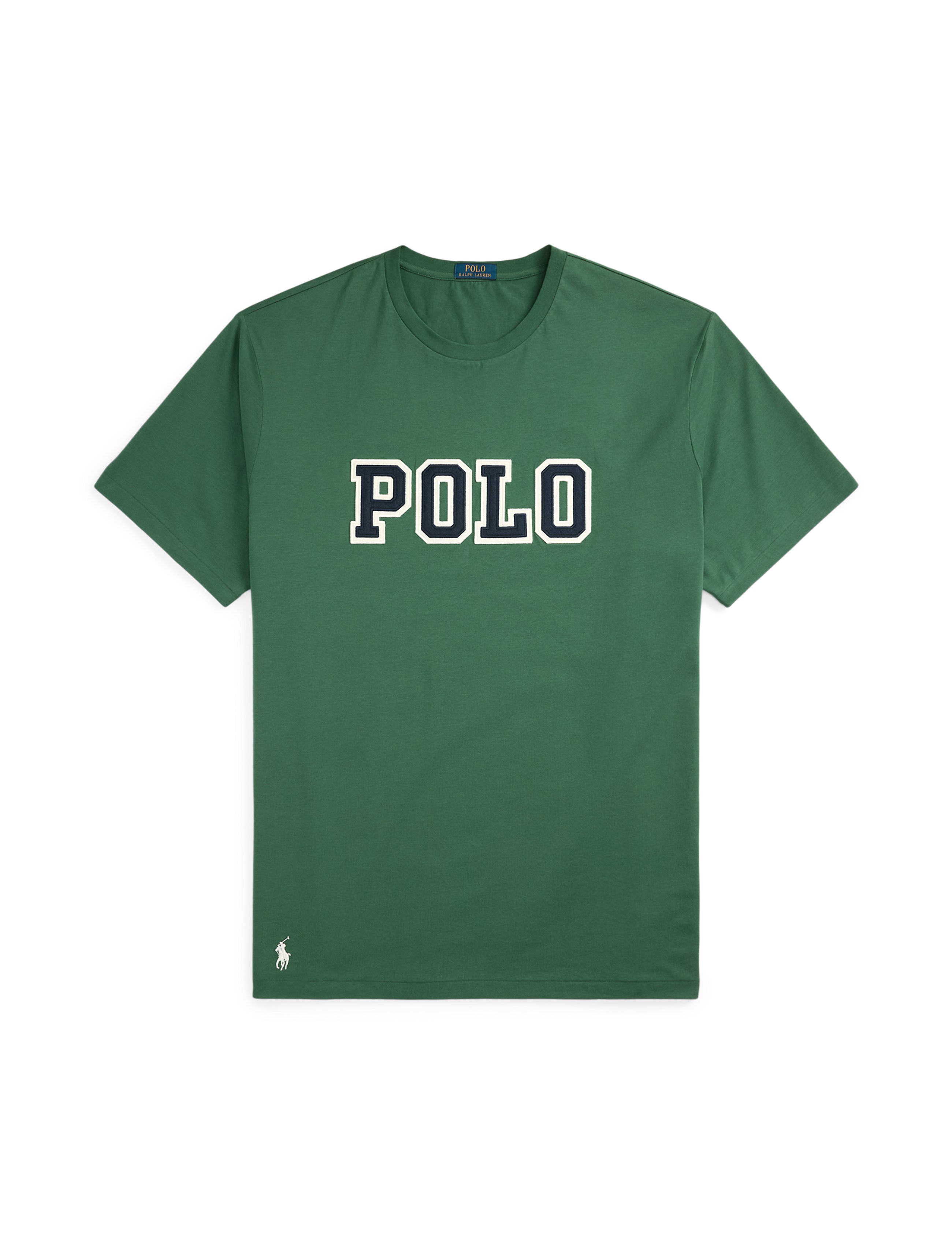 This sophisticated Polo Ralph Lauren Men's Big & Tall Logo Jersey Tee Shirt offers premium comfort in pure cotton construction. The classic crew neck and short sleeve design is elevated by distinctive felt appliqués spelling "Polo" at center front. Available in refined Green or White colorways, this jersey tee features a clean straight hem for a polished silhouette that maintains the brand's timeless aesthetic.
