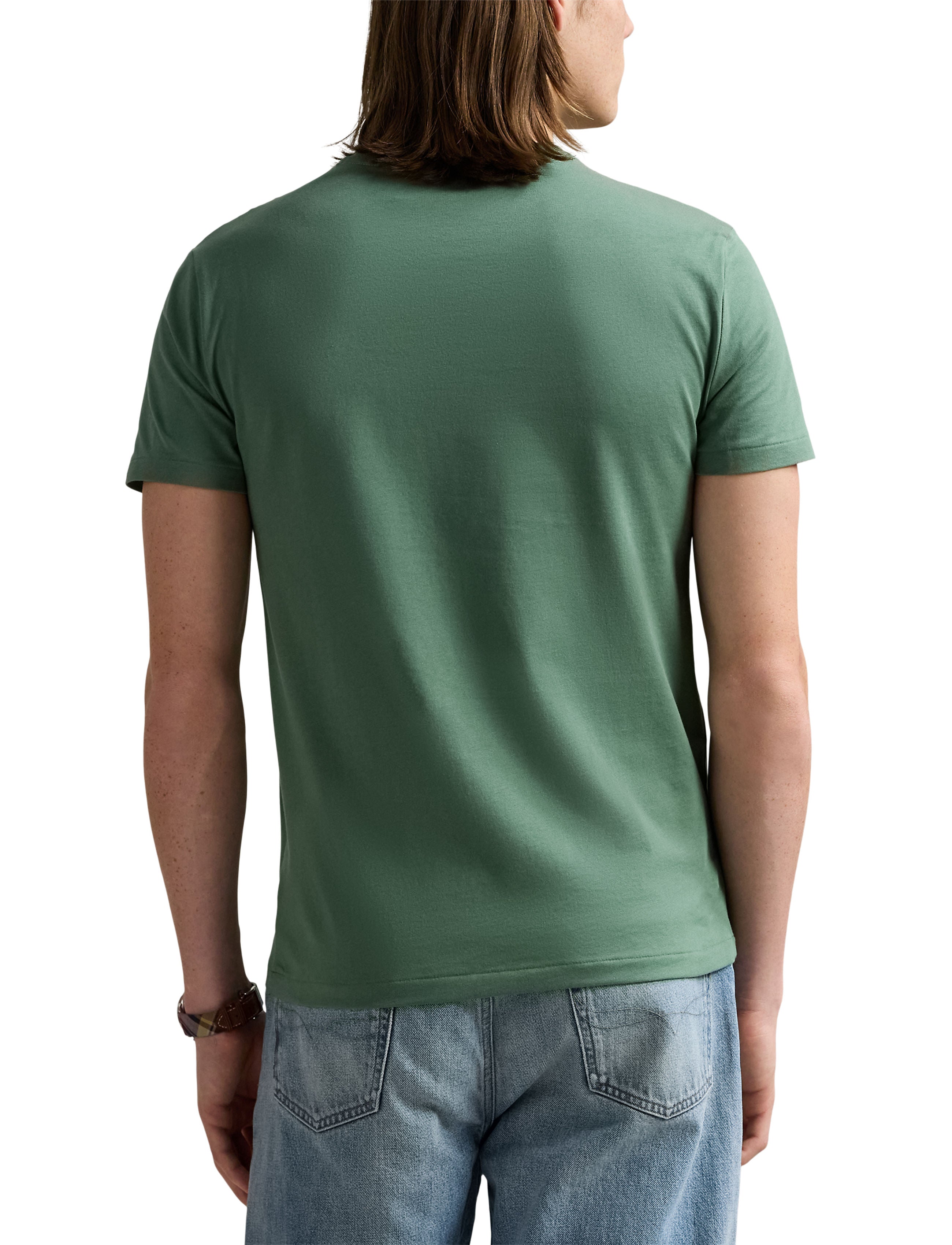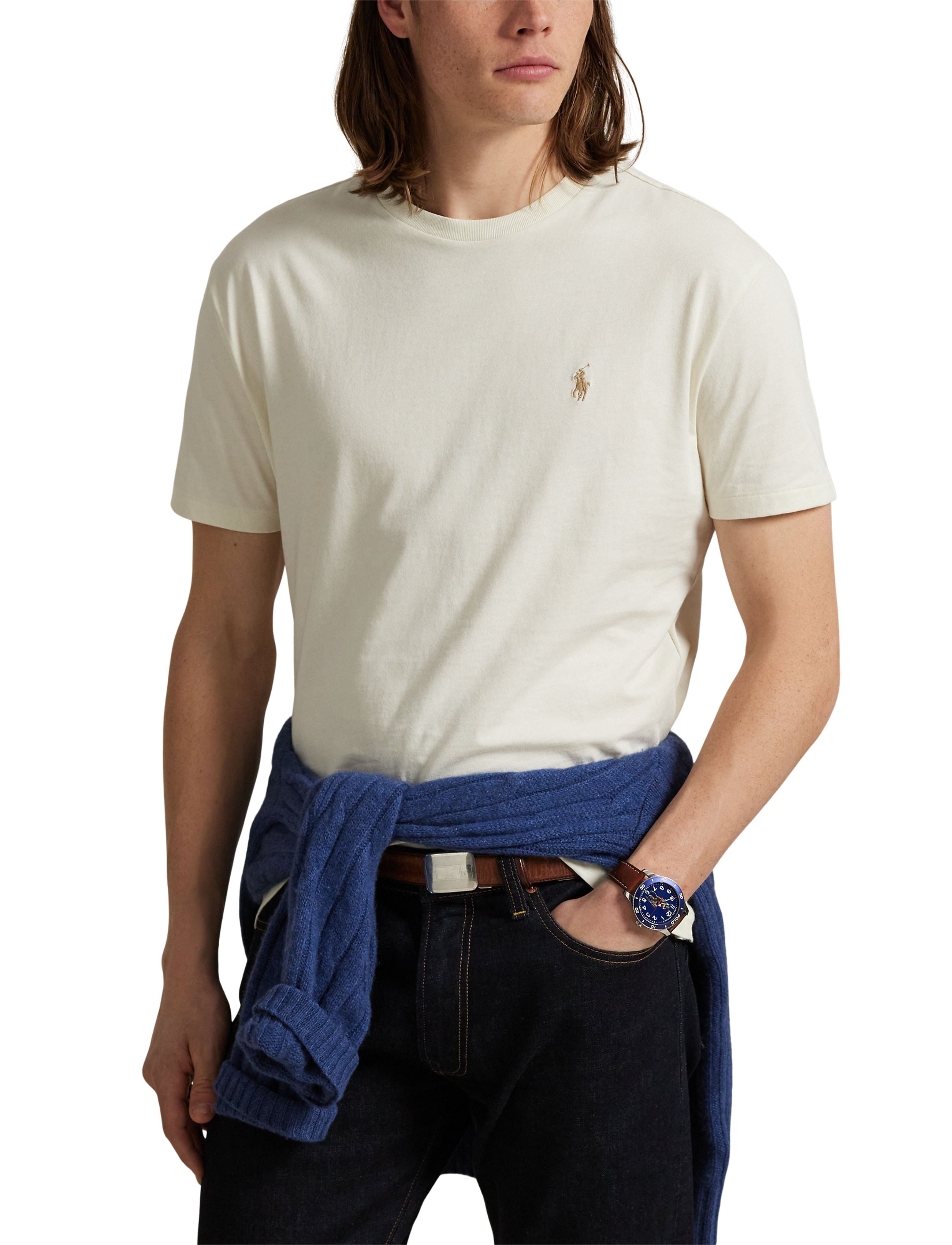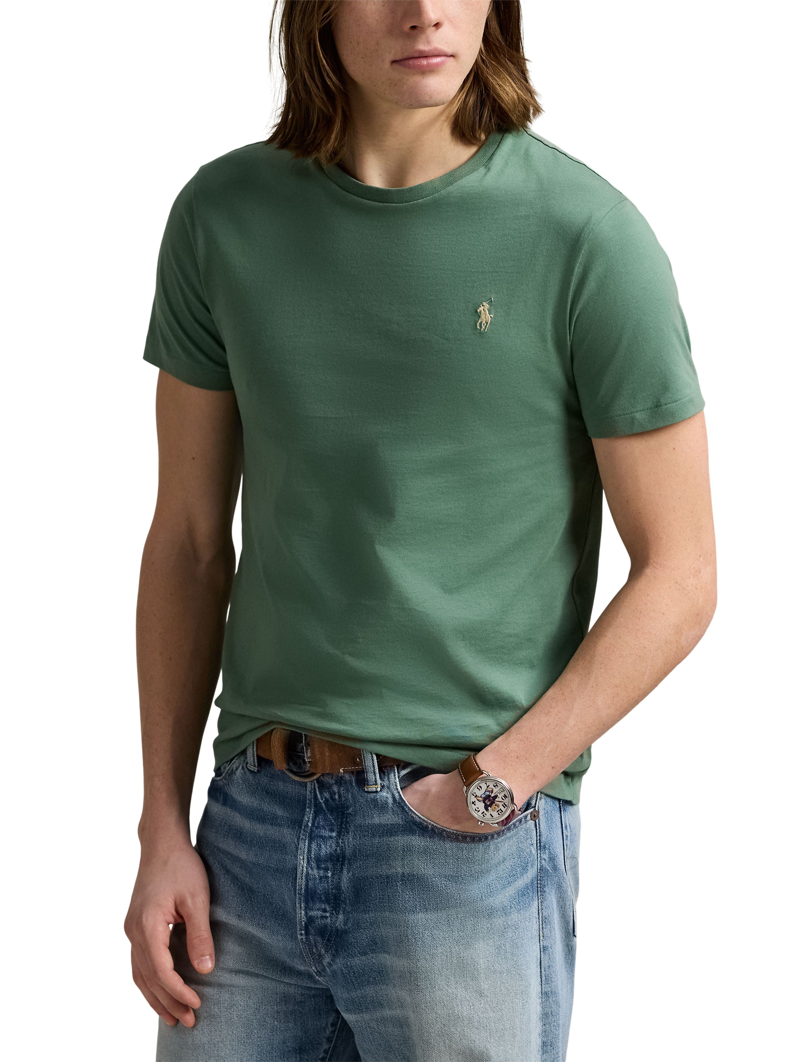 This sophisticated Polo Ralph Lauren Men's Jersey Crewneck Tee in verdant green or cream combines timeless style with exceptional comfort. Crafted from pure cotton jersey, this short-sleeve essential features the iconic embroidered Pony emblem at the left chest—a subtle hallmark of distinguished quality and heritage craftsmanship.