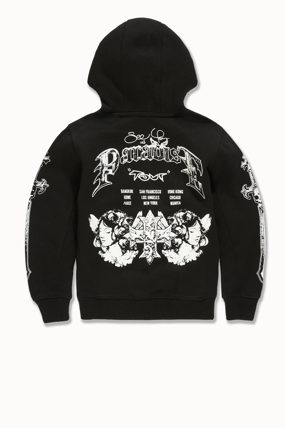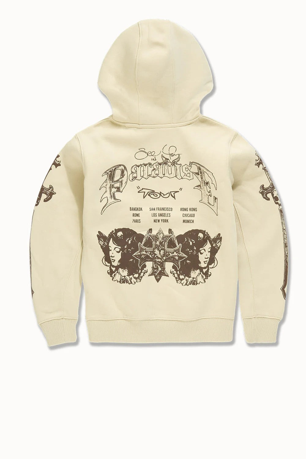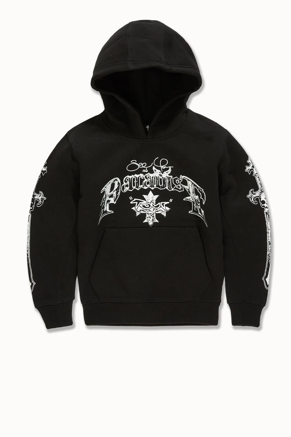 The Jordan Craig See You In Paradise Tour Pullover Hoodie combines comfort and style with its soft cotton-polyester blend. Featuring kangaroo pockets and elasticated waistband and cuffs, it offers a secure fit and practical warmth. The striking graphics on both front and back make a bold statement, while available color options—Black, Red, and Khaki—allow versatile wardrobe pairing. Perfect for kids seeking durable, fashionable layering for any occasion.