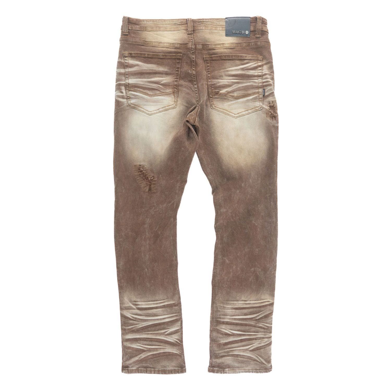 Makobi's Lorenzo denim jeans deliver rugged style tailored for big and tall frames. Crafted with a regular fit that accommodates a fuller silhouette without excess bulk, these brown jeans feature the brand's signature rip and repair design for an edgy, contemporary look. The classic five-pocket construction ensures practical functionality alongside fashion-forward aesthetics. Built for men who demand both comfort and distinctive style, Lorenzo jeans offer versatile wear from casual weekends to layered seasonal outfits.