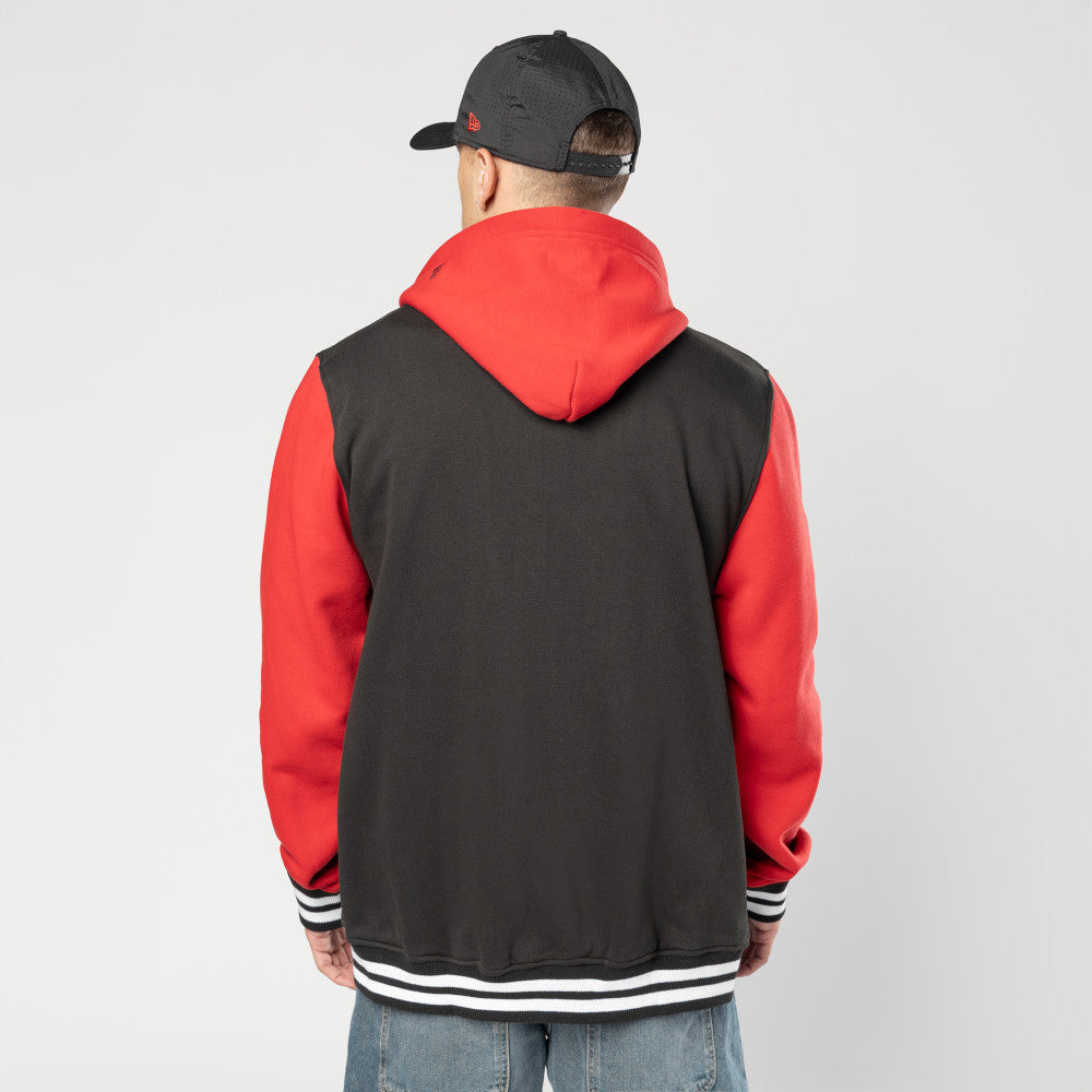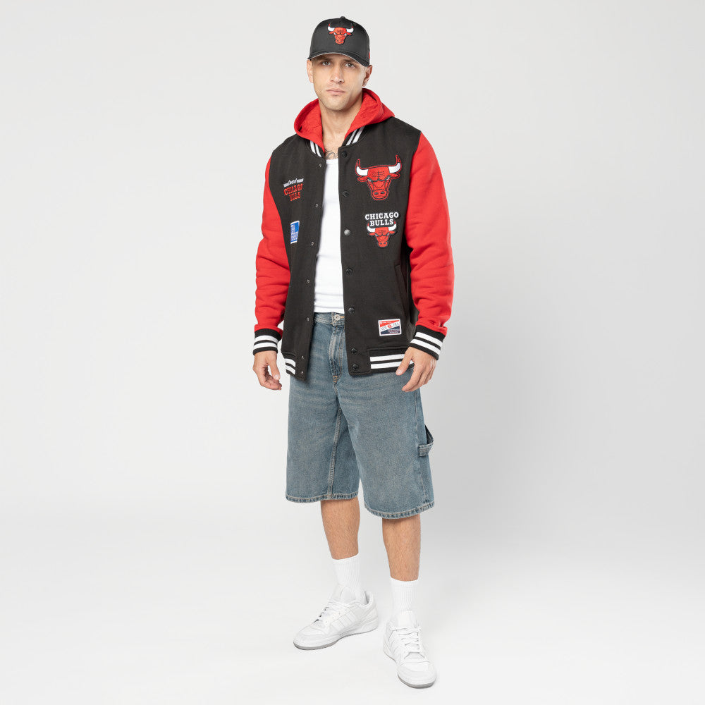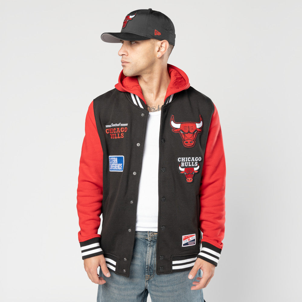 This New Era Hooded Jacket in black showcases official Chicago Bulls and Eastern Conference patchwork, combining style with team pride. Designed with elasticated cuffs and waistband, it offers a secure fit while the snap button-down front allows easy layering. The hood adds extra protection, making this jacket both functional and perfect for fans seeking a polished, athletic look.