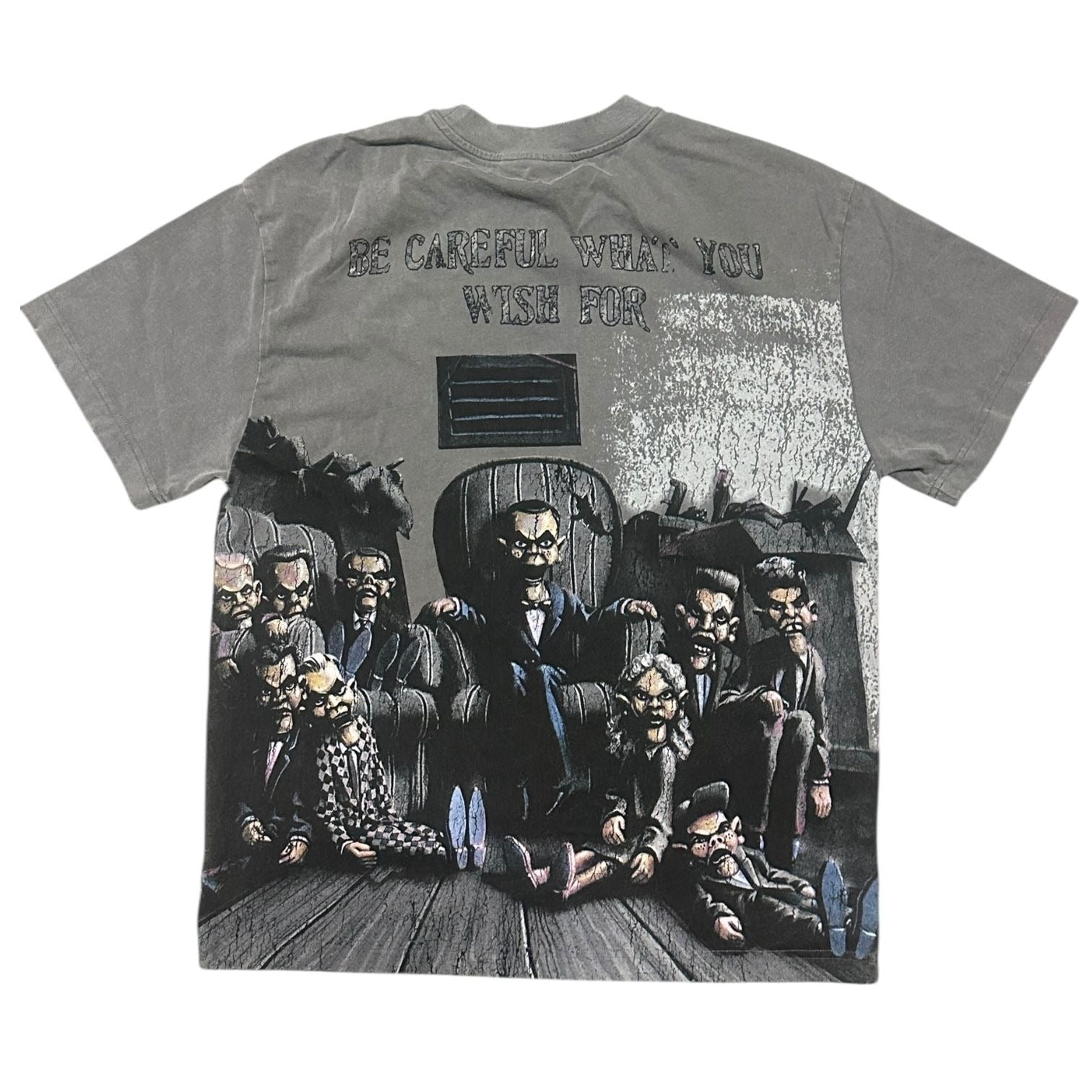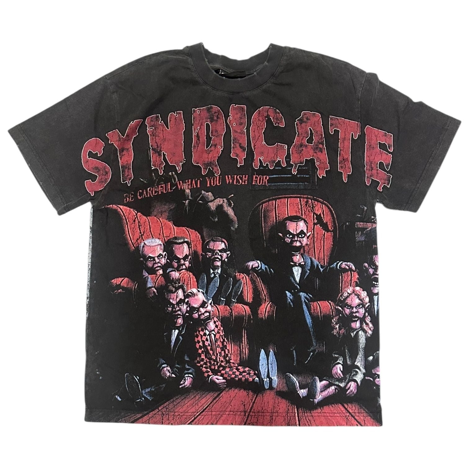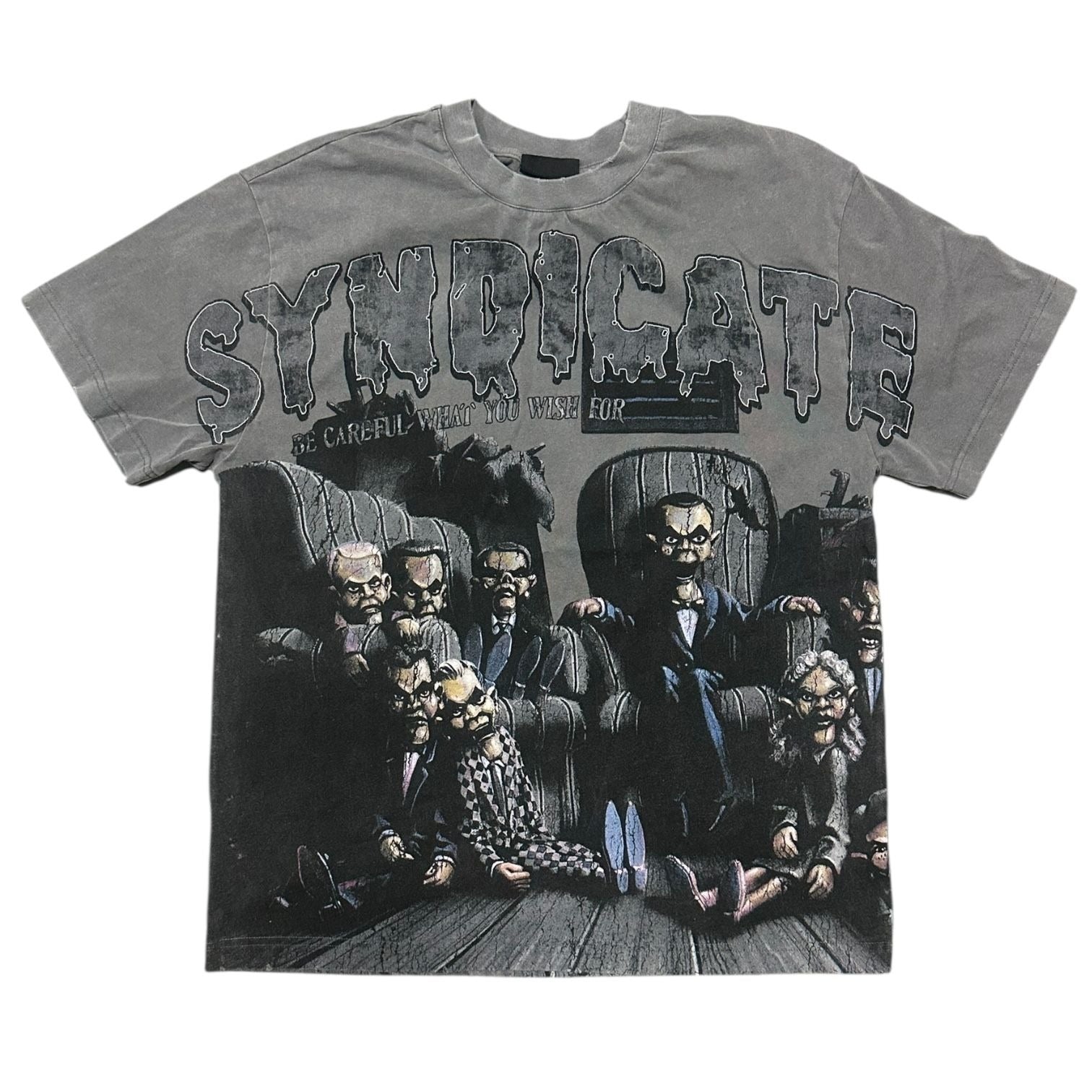 This Syndicate Men's Short Sleeve Tee Shirt in grey or black features a stylish graphic on the front, perfectly blending casual comfort with modern design. Crafted with a classic crew neckline and straight hem, it offers a clean silhouette ideal for everyday wear. The "Wishes" style adds a unique touch, making it a versatile piece for your wardrobe.