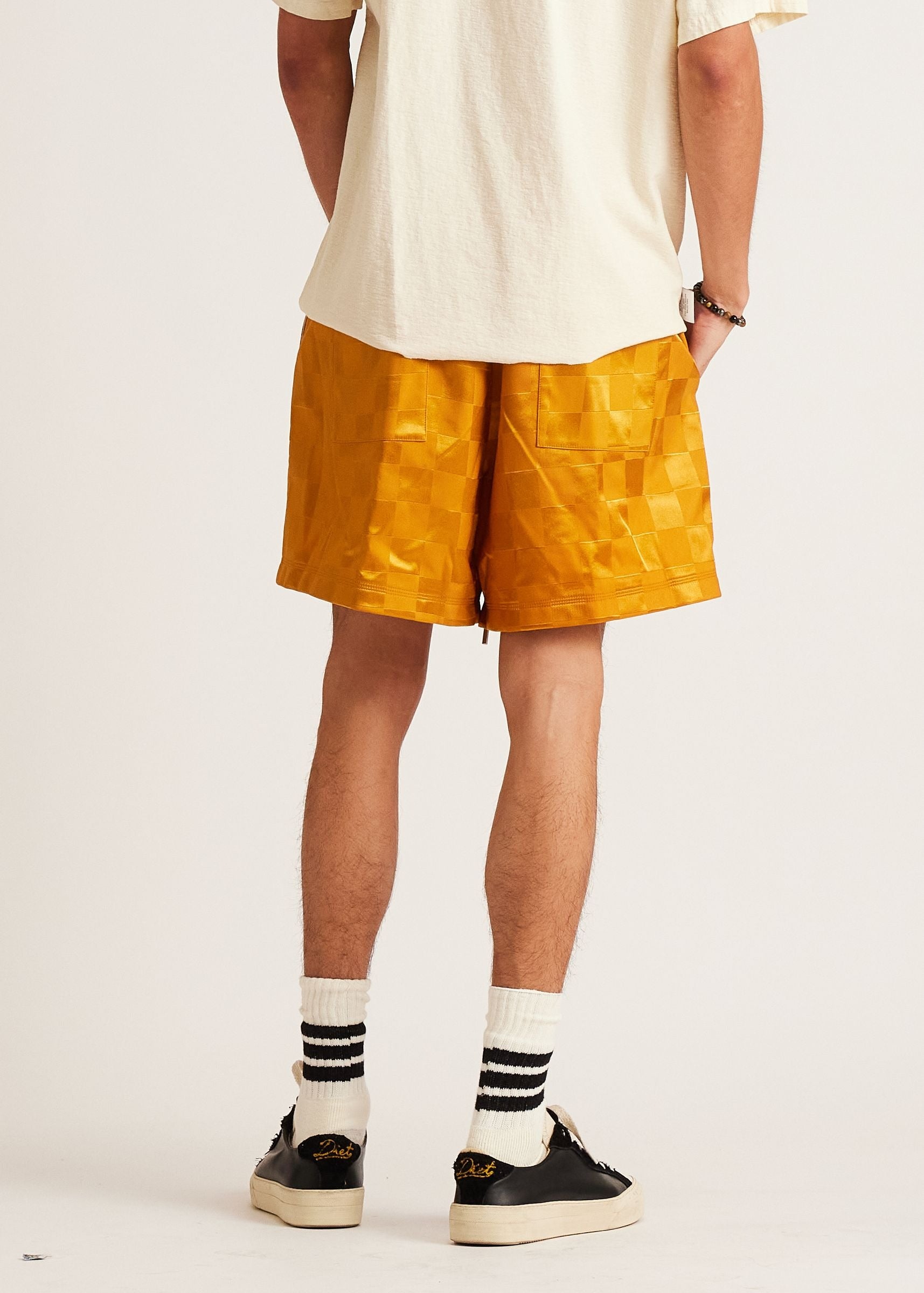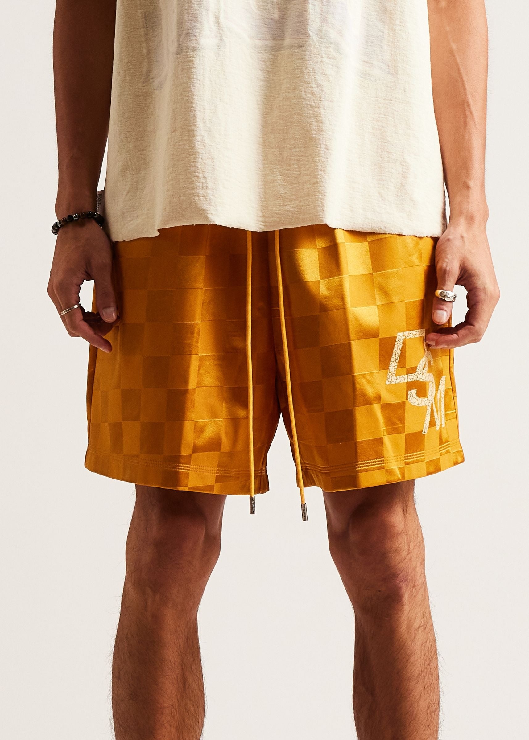 Elevate your casual wardrobe with the Diet Starts Monday Checkered Nylon Shorts. Featuring a refined yellow and black checkered pattern, these shorts combine style with comfort through an elasticated waistband and adjustable drawstring. Practicality meets elegance with two angled front pockets and a single back pocket, perfect for keeping essentials close. Ideal for those who appreciate sophisticated design in everyday wear.