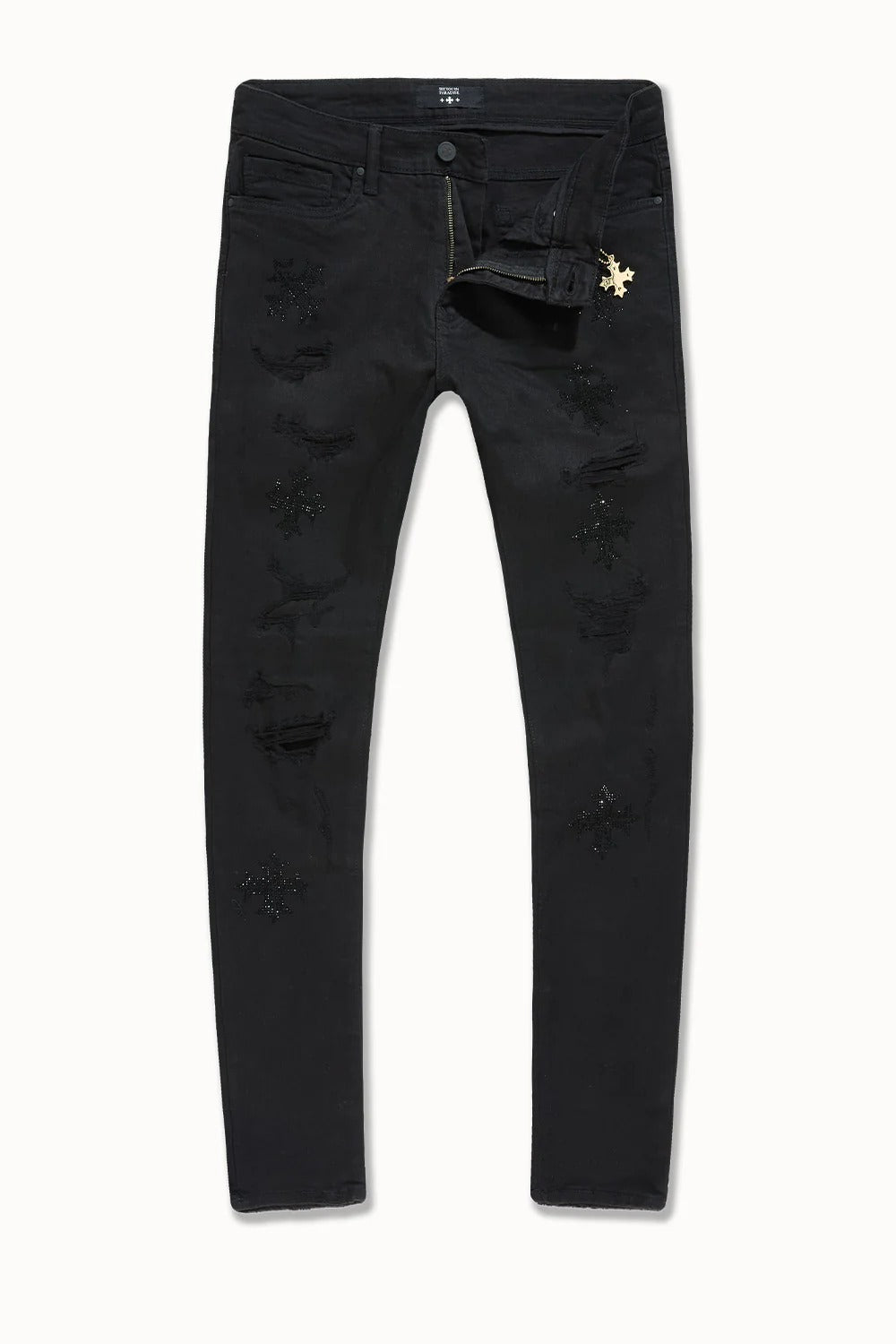 Jordan Craig See You Paradise Denim Jeans in the Limelight style combine advanced design with premium comfort. Crafted from 99% cotton and 1% elastane, these slim taper fit jeans feature a regular waist and a modern taper from knee to ankle, enhancing mobility while maintaining a sleek silhouette. The antique blue and black color options showcase 3D baked wrinkles and a distinctive rip & repair design with raw denim backing for rugged sophistication. Super stretch fabric ensures all-day wearability, complemented by subtle rhinestone detailing for a refined, expert finish.