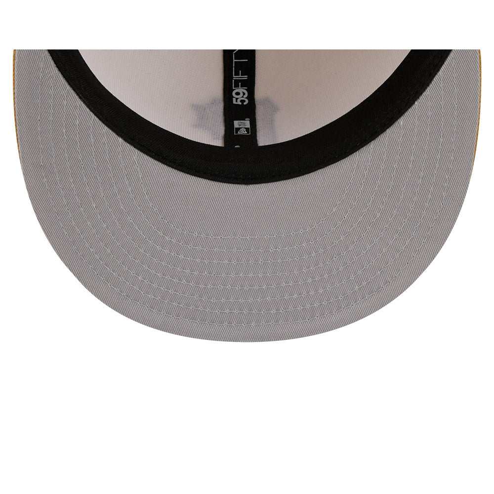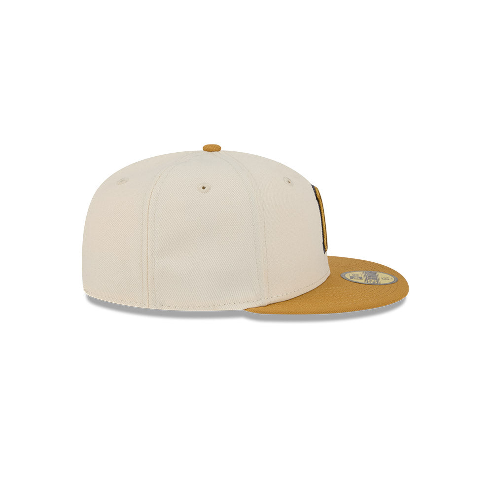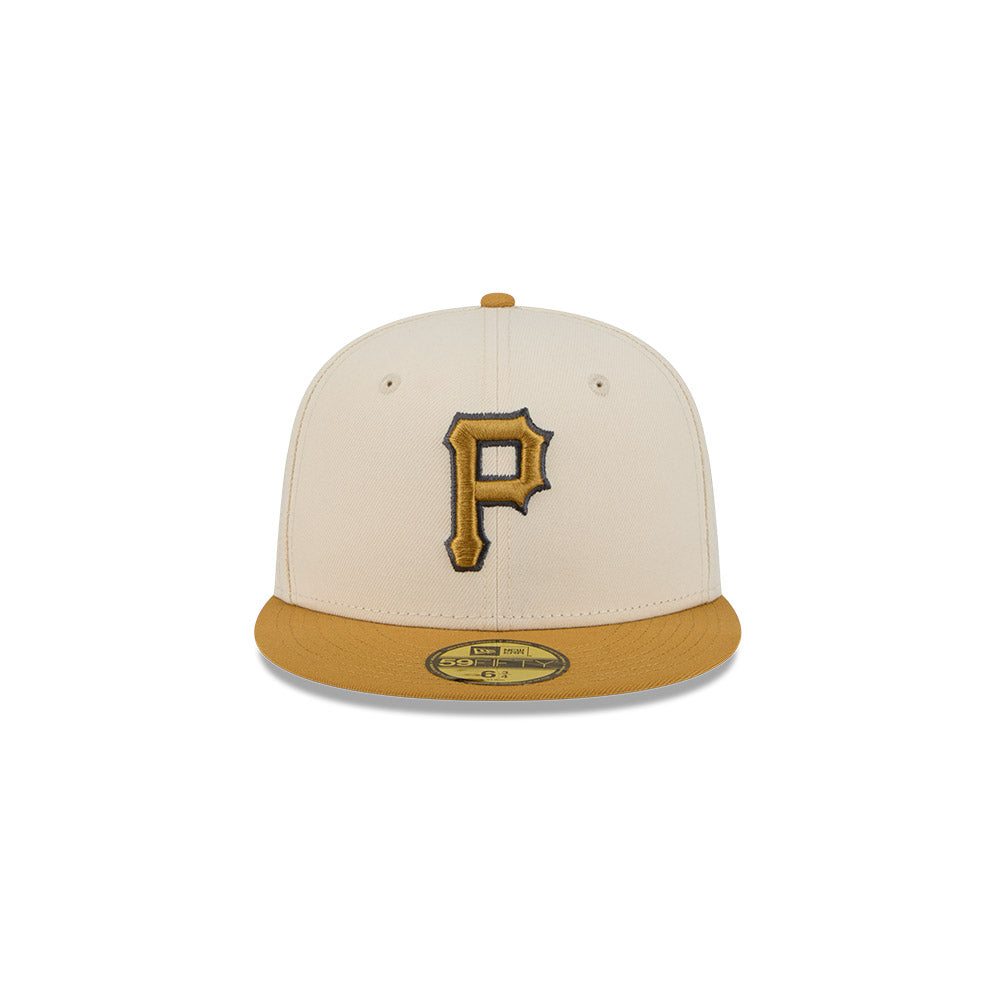Classic New Era 59/50 fitted hat featuring the Pittsburgh Pirates. Crafted in cream and khaki with the iconic Pirates "P" logo embroidered on the front. Finished with a khaki button detail on top and grey undervisor for a sharp, authentic look. Perfect for Pirates fans and baseball enthusiasts who appreciate quality headwear.
