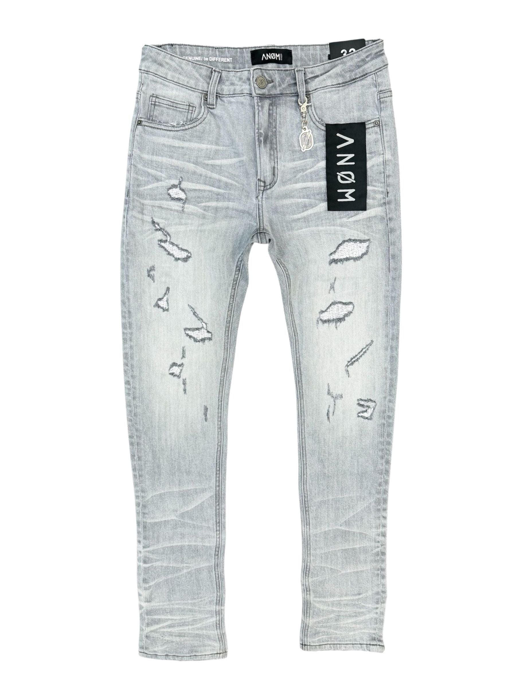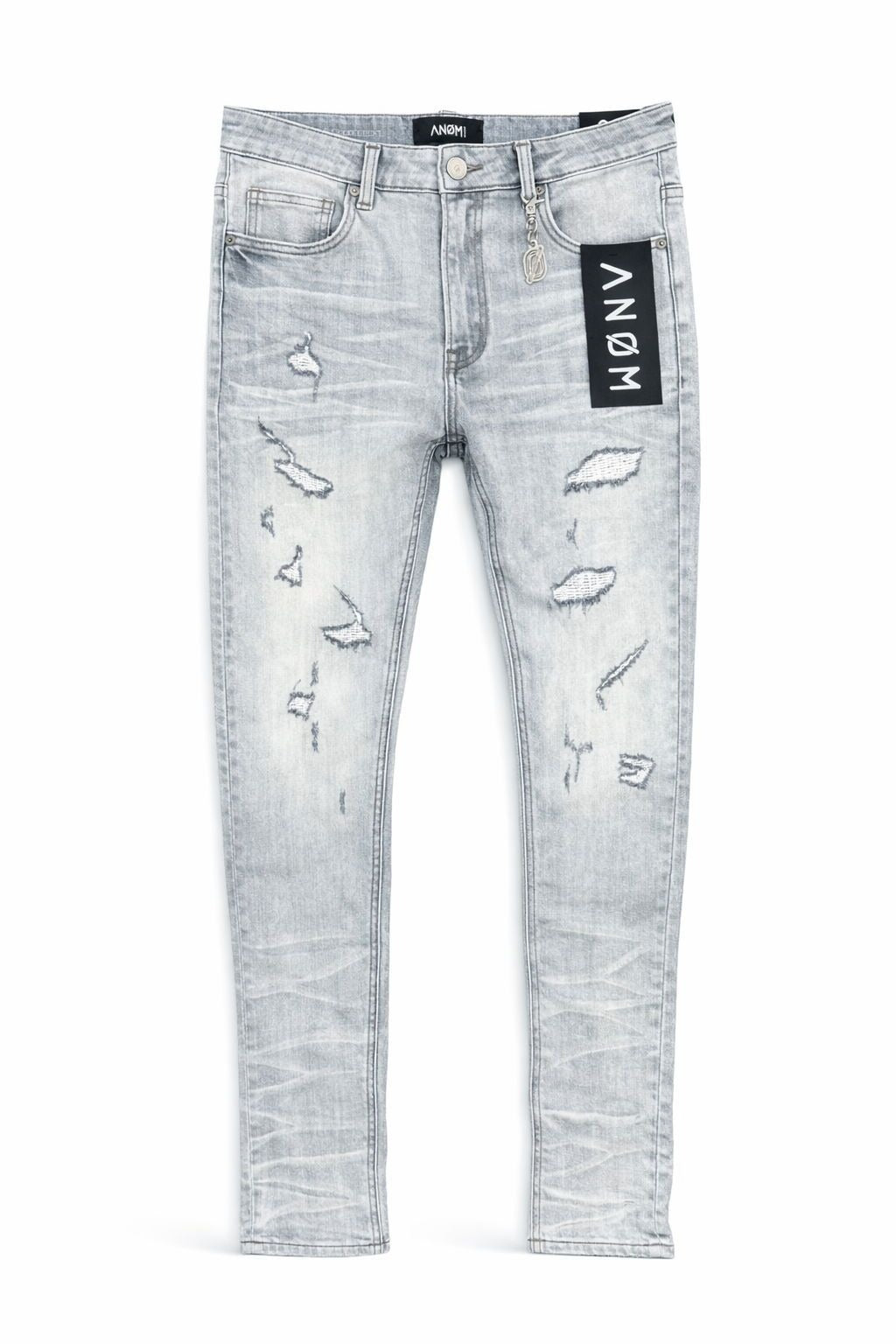 Anom Men's Denim Jeans in Light Grey deliver contemporary style with the Rift design. Featuring a skinny fit silhouette and stretch denim fabric, these jeans offer comfort and mobility throughout your day. The classic 5-pocket construction pairs with an on-trend rip and repair aesthetic for an edgy, modern look. Perfect for casual wear or dressing up your everyday rotation.