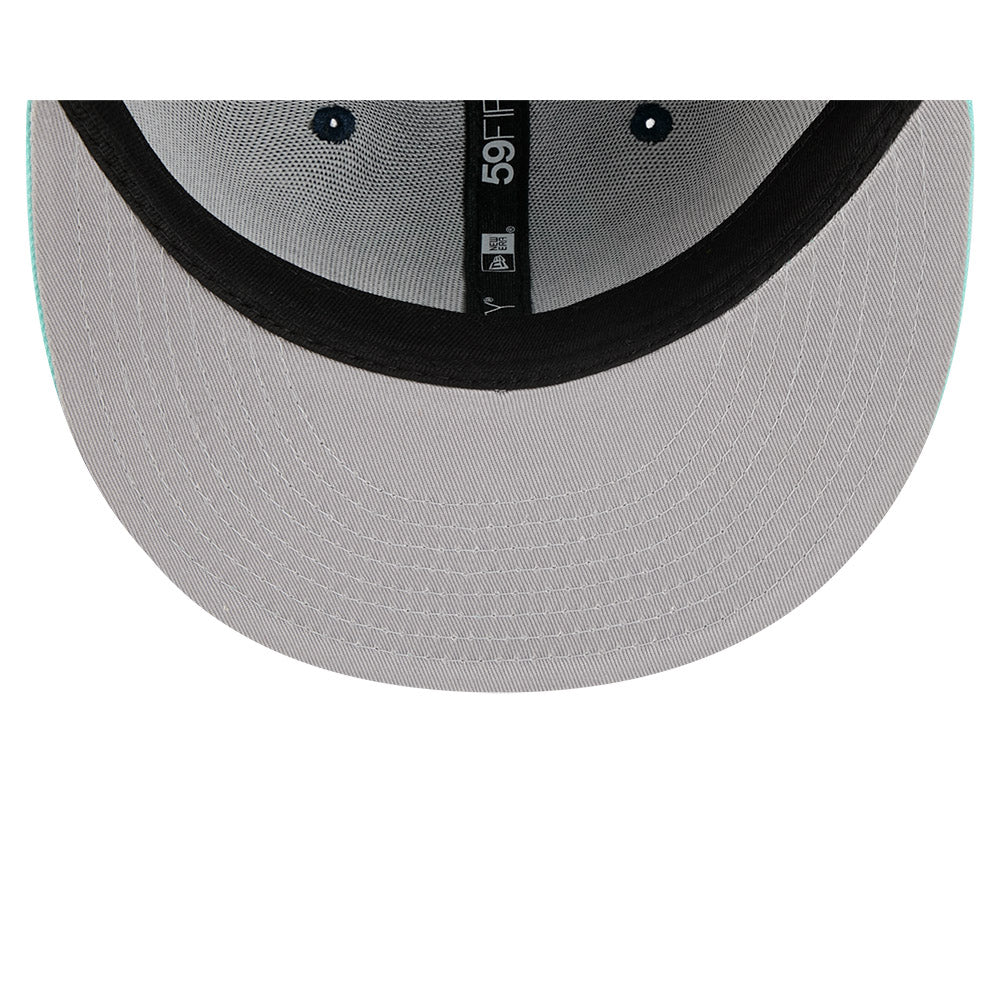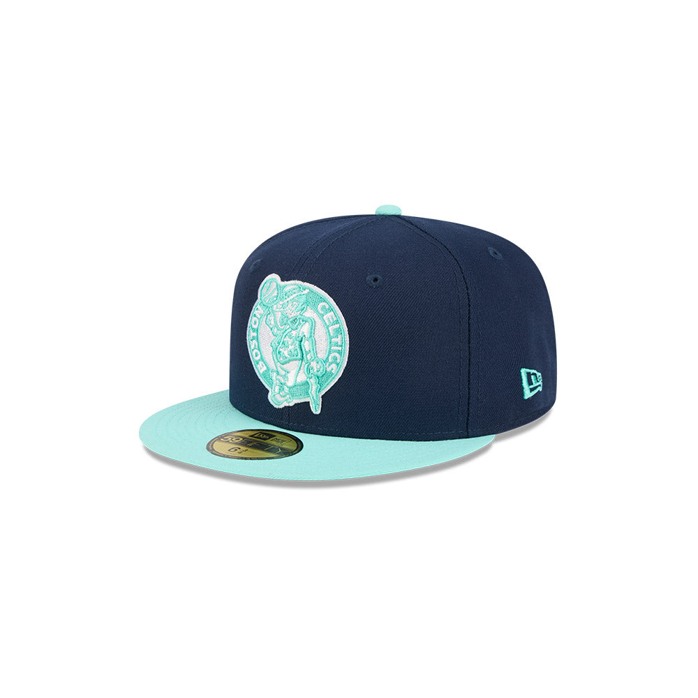 Elevate your game day style with this New Era 59/50 fitted hat featuring the iconic Boston Celtics logo. The sharp navy blue crown is accented with aqua detailing, including a standout aqua button on top and the team logo in matching aqua on the front. The grey undervisor provides a classic contrast finish. Designed for the true Celtics fan who demands quality and authentic team spirit.