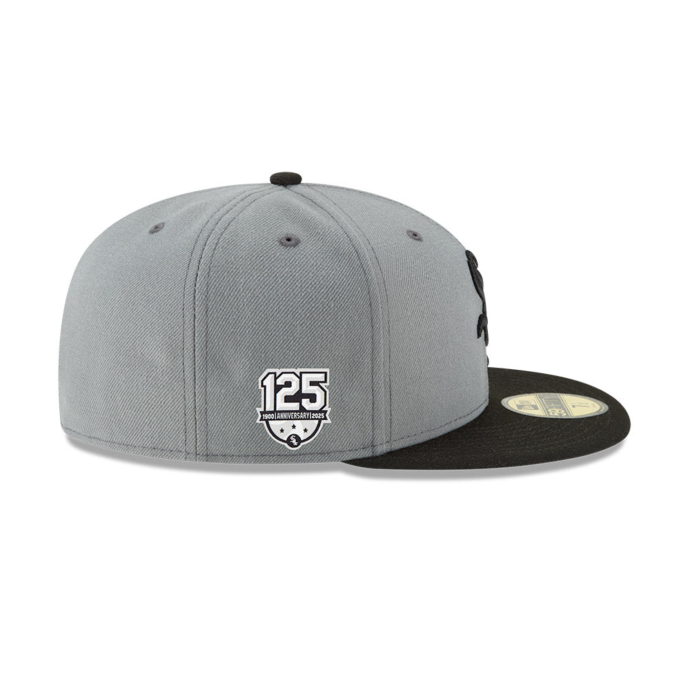 Step up your fan game with the exclusive New Era 59/50 Hat for the Chicago White Sox. This stylish hat features black lettering, a silver "125 Year" side patch, and a black button on top. The grey undervisor adds a touch of luxury to this premium accessory.