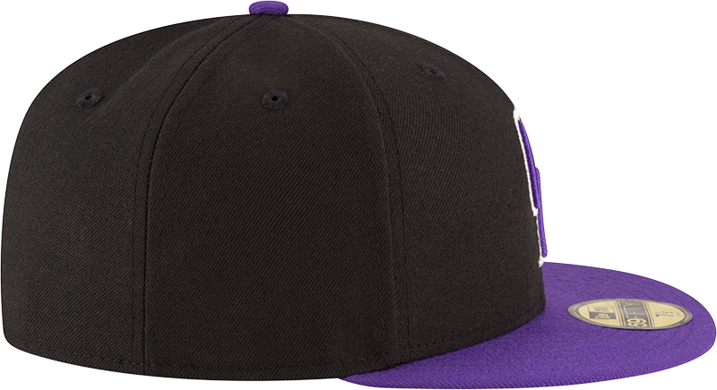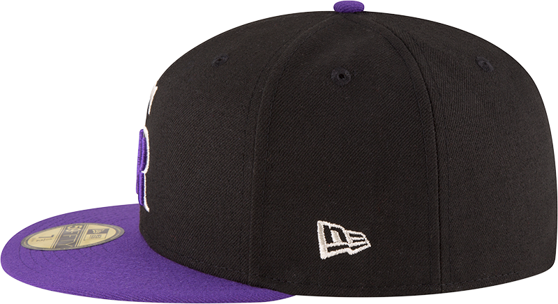 Elevate your game-day look with the New Era 59/50 Fitted Hat, featuring the iconic Colorado Rockies design. This sophisticated black and purple cap showcases a purple button atop and a sleek black undervisor for a refined finish. The Colorado Rockies lettering is accented with a silver outline, adding a subtle touch of elegance. Crafted for a perfect fit, this hat combines style and comfort for fans who appreciate quality and detail.