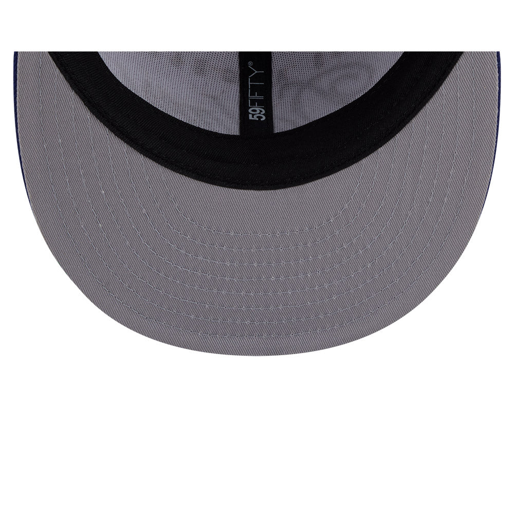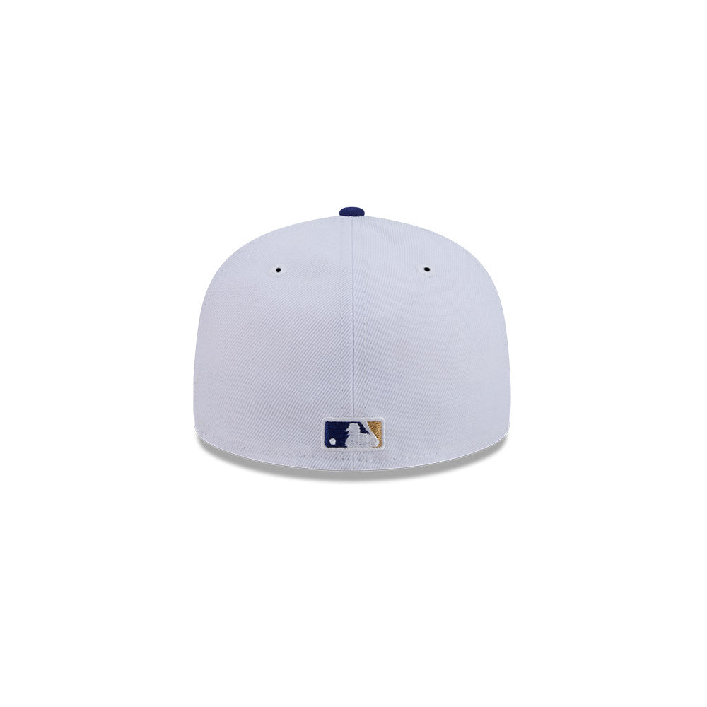 Classic New Era 59/50 fitted hat featuring the Los Angeles Dodgers in timeless scripted lettering across the front. The iconic "D" logo adorns the side panel, while a blue button tops the crown for authentic vintage appeal. White crown with royal blue accents and grey undervisor complete this essential piece for any Dodgers fan. Structured fit designed for a polished, game-day ready look.