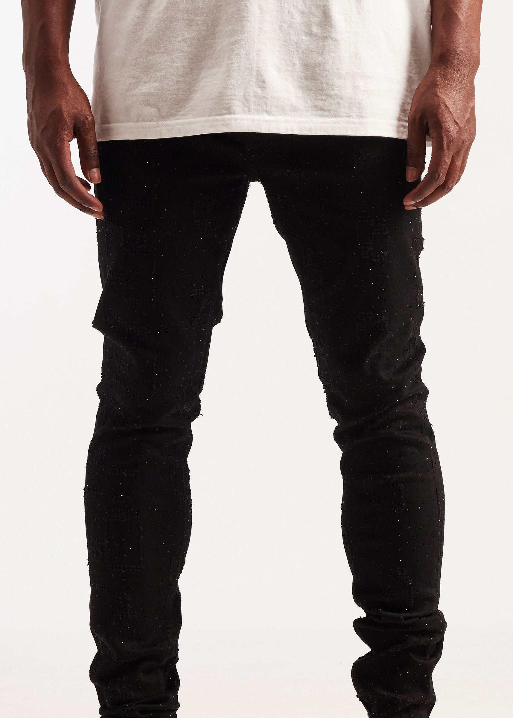 Embellish Men's Denim Jeans in Black Ice deliver contemporary edge with intentional rip and repair detailing throughout. The Sean style features a sleek skinny fit with a standard 34" inseam, designed for a refined silhouette. Classic five-pocket construction ensures timeless functionality. Perfect for layering or standalone wear, these jeans balance modern distressing with polished sophistication, making them an essential addition to any discerning wardrobe.