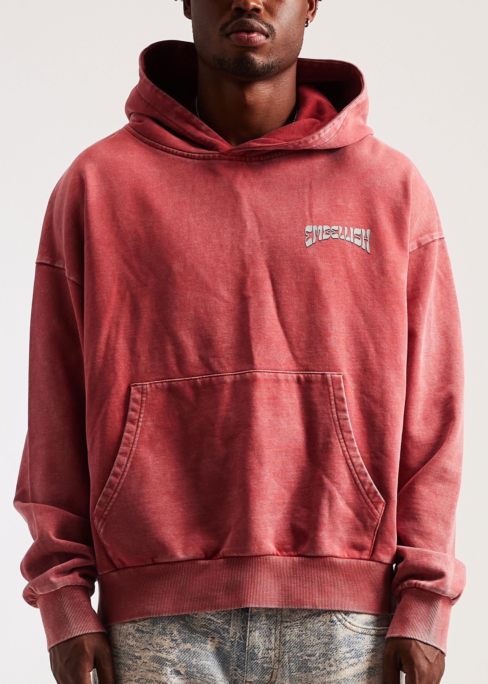The Embellish Men's Hoodie in Vintage Red combines timeless style with everyday comfort. Featuring a striking graphic on the front chest and an expansive design across the back, this piece makes a bold statement. The classic hooded silhouette, kangaroo pocket, and elasticated waistband and arm cuffs deliver both functionality and refined appeal. Cut in a regular fit, it's versatile enough for casual outings or layered styling. A sophisticated essential for the modern wardrobe.