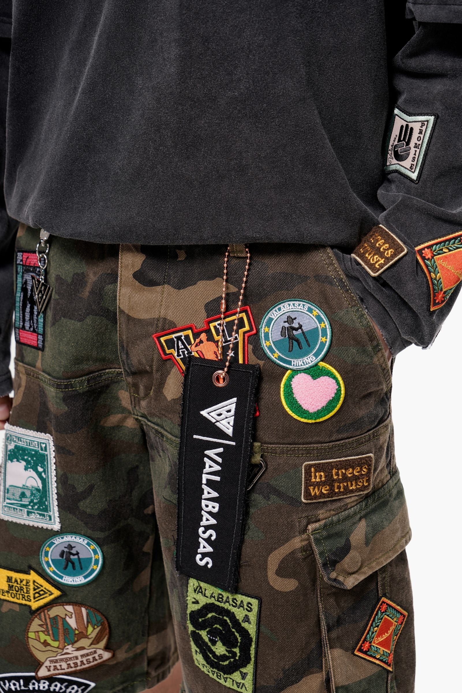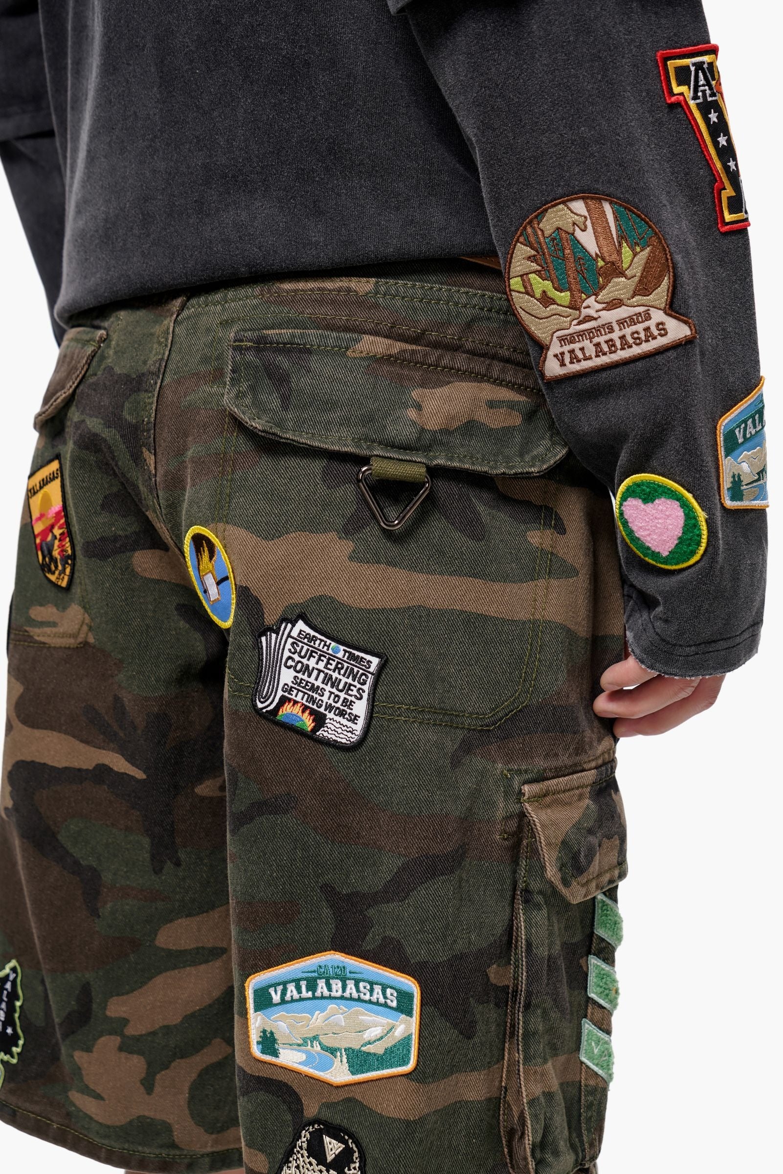 Valabasas Men's Cargo Shorts in District style deliver bold green camo patchwork design with serious functionality. Oversized fit provides comfort and contemporary edge, while multi-use cargo pockets keep essentials within reach. Flap back pockets add practical storage without compromising style. Perfect for weekend wear, outdoor adventures, or casual everyday looks that demand both versatility and visual impact.