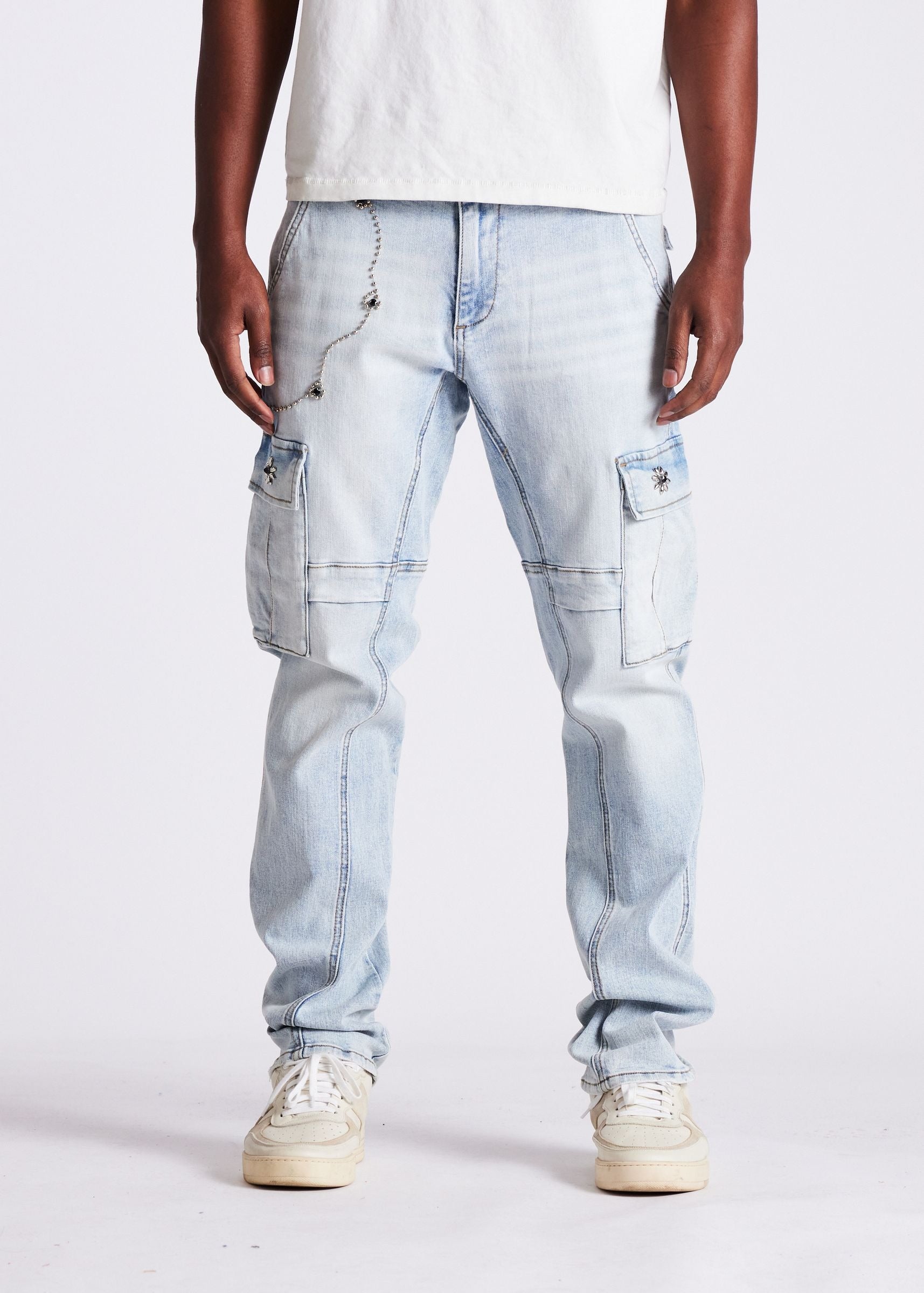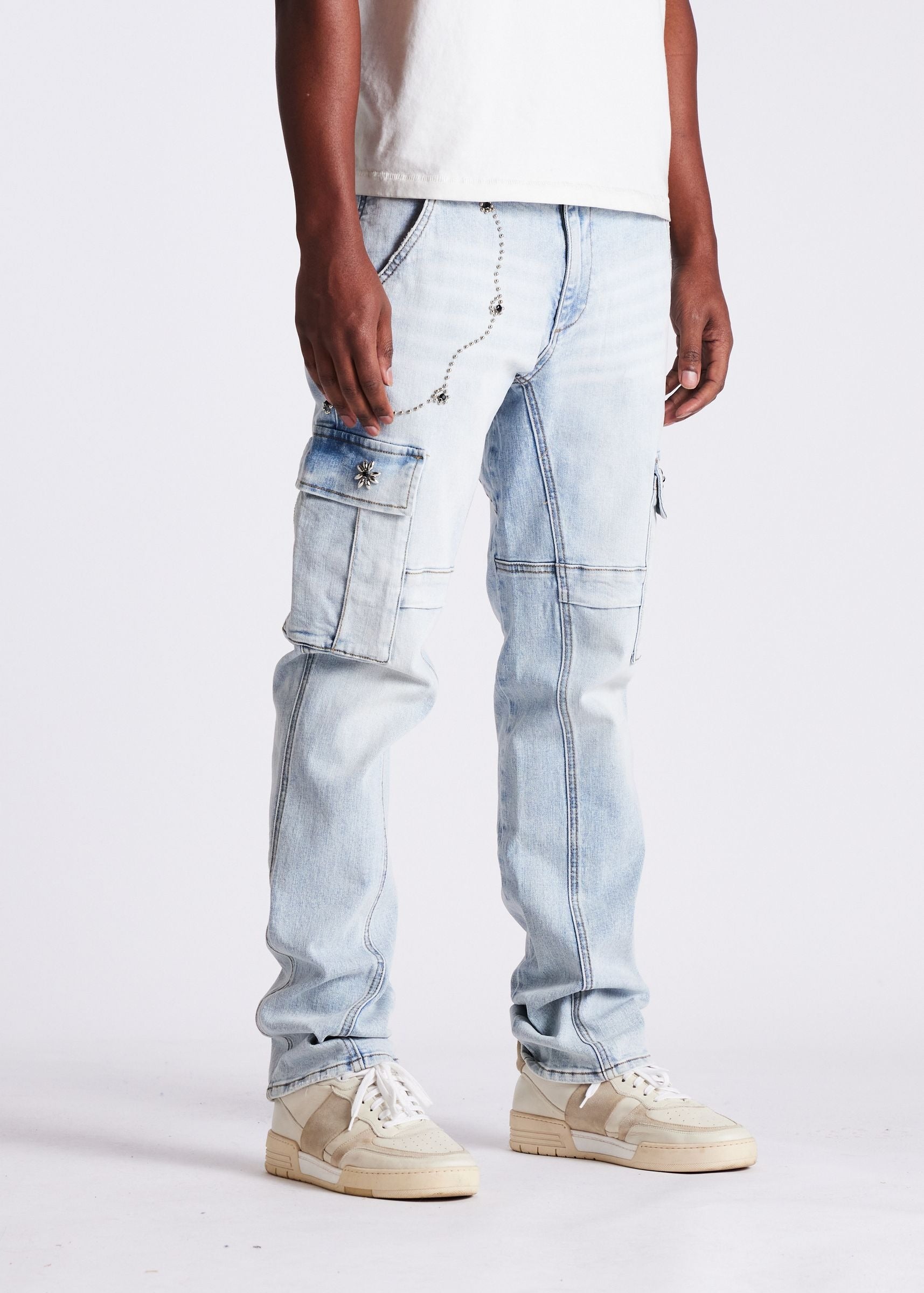 Crafted for the modern man, the Crysp Denim Jeans in Cades Cargo style combine functionality with a sleek silhouette. Featuring a signature skinny fit and a standard 34" inseam, these blue jeans offer a tailored look without sacrificing comfort. The 7-pocket design includes practical cargo pockets at the knees, providing extra storage while enhancing the rugged aesthetic. Ideal for those seeking versatile denim that balances style and utility.