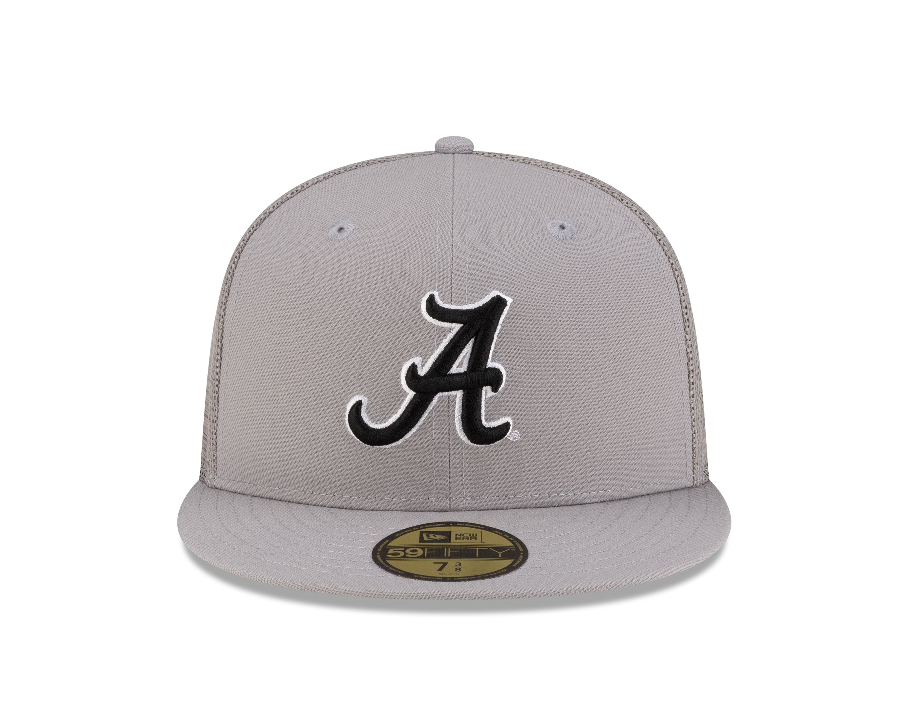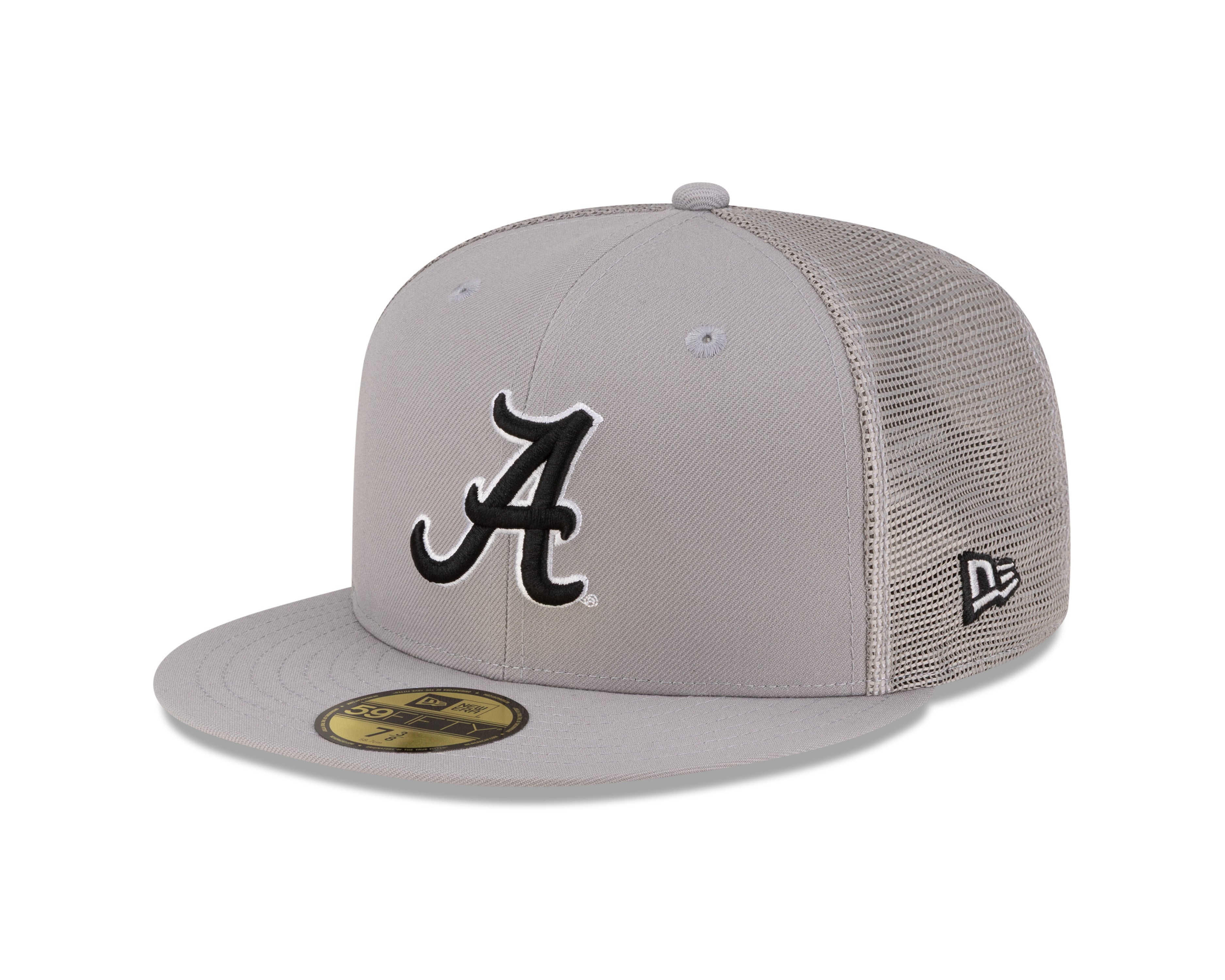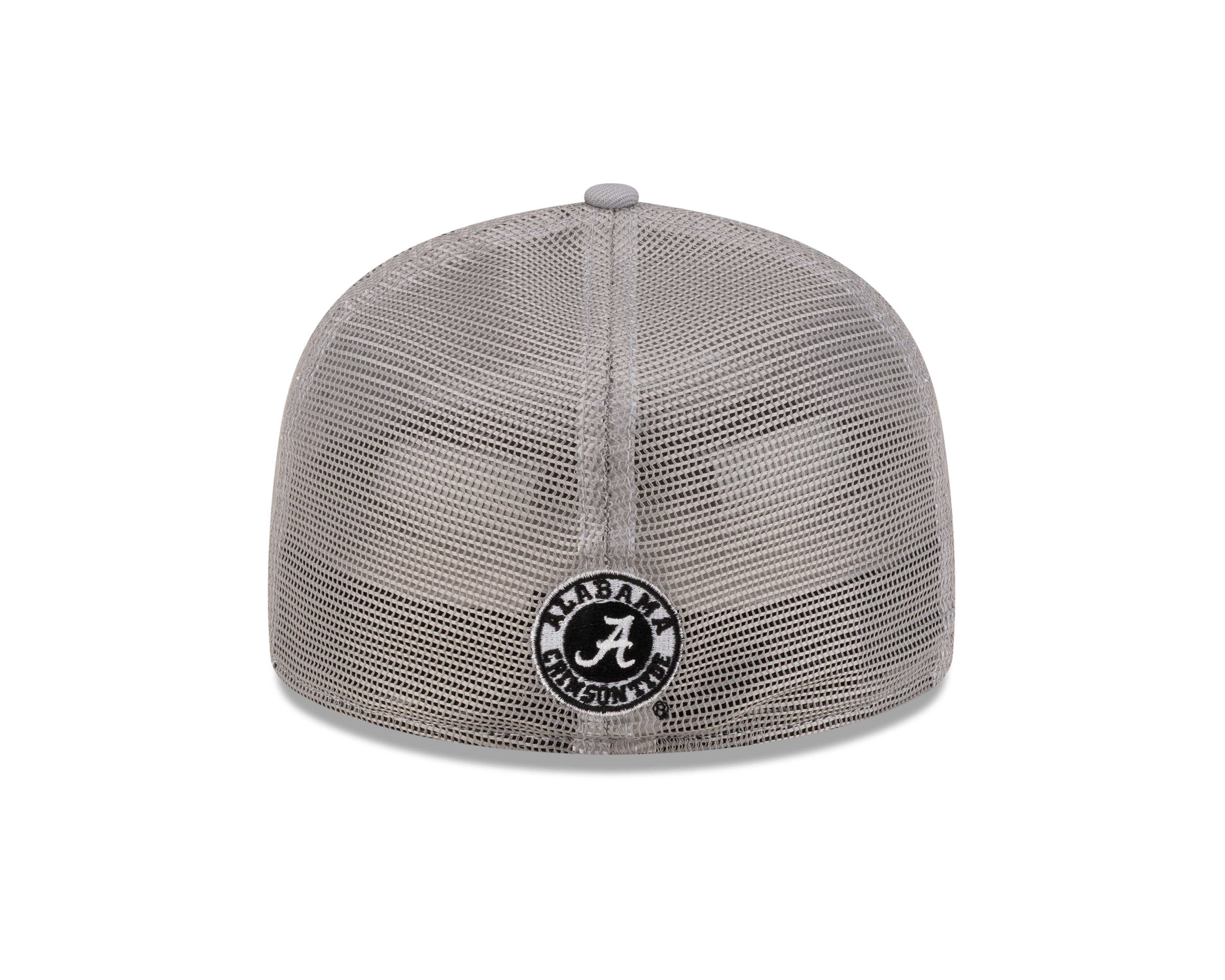 New Era 59/50 fitted trucker hat in grey featuring the Alabama Crimson Tide logo. Bold Alabama script adorns the front in black with white outline, while the iconic Crimson Tide logo sits on the back. Classic structured fit with authentic New Era quality. Perfect for game day or everyday wear for dedicated Alabama fans.