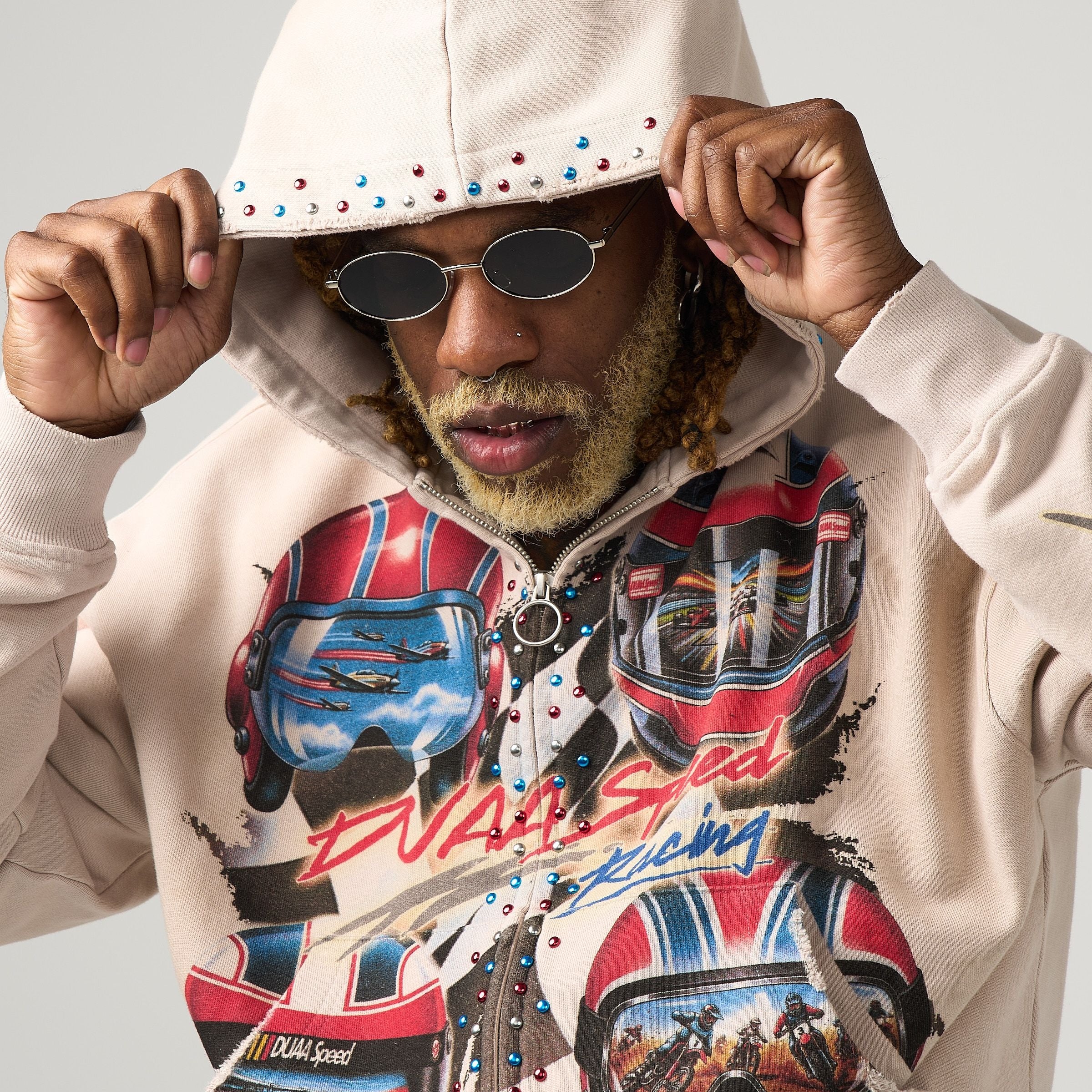 Stay comfortable and stylish in the DUAA Velocity Washed Hoodie, designed for effortless everyday wear. This men's hoodie features a distinctive washed finish that gives it a relaxed, lived-in aesthetic. The full zip front makes layering simple, while the eye-catching graphic adds personality to your look. Practical split kangaroo pockets keep your hands warm and essentials close, and the elasticated waistband and arm cuffs ensure a secure, flattering fit that moves with you. Perfect for casual outings or laid-back days at home.