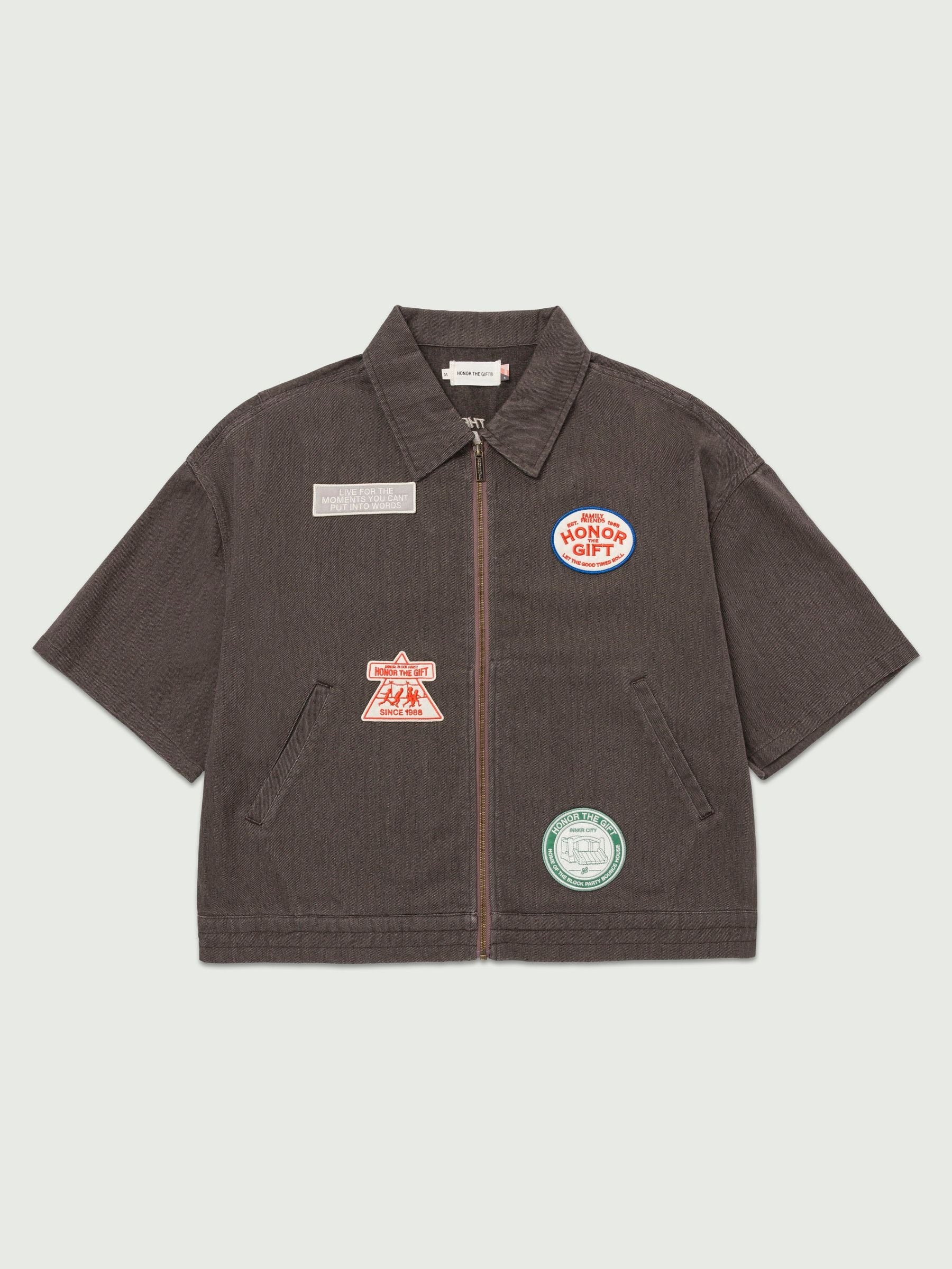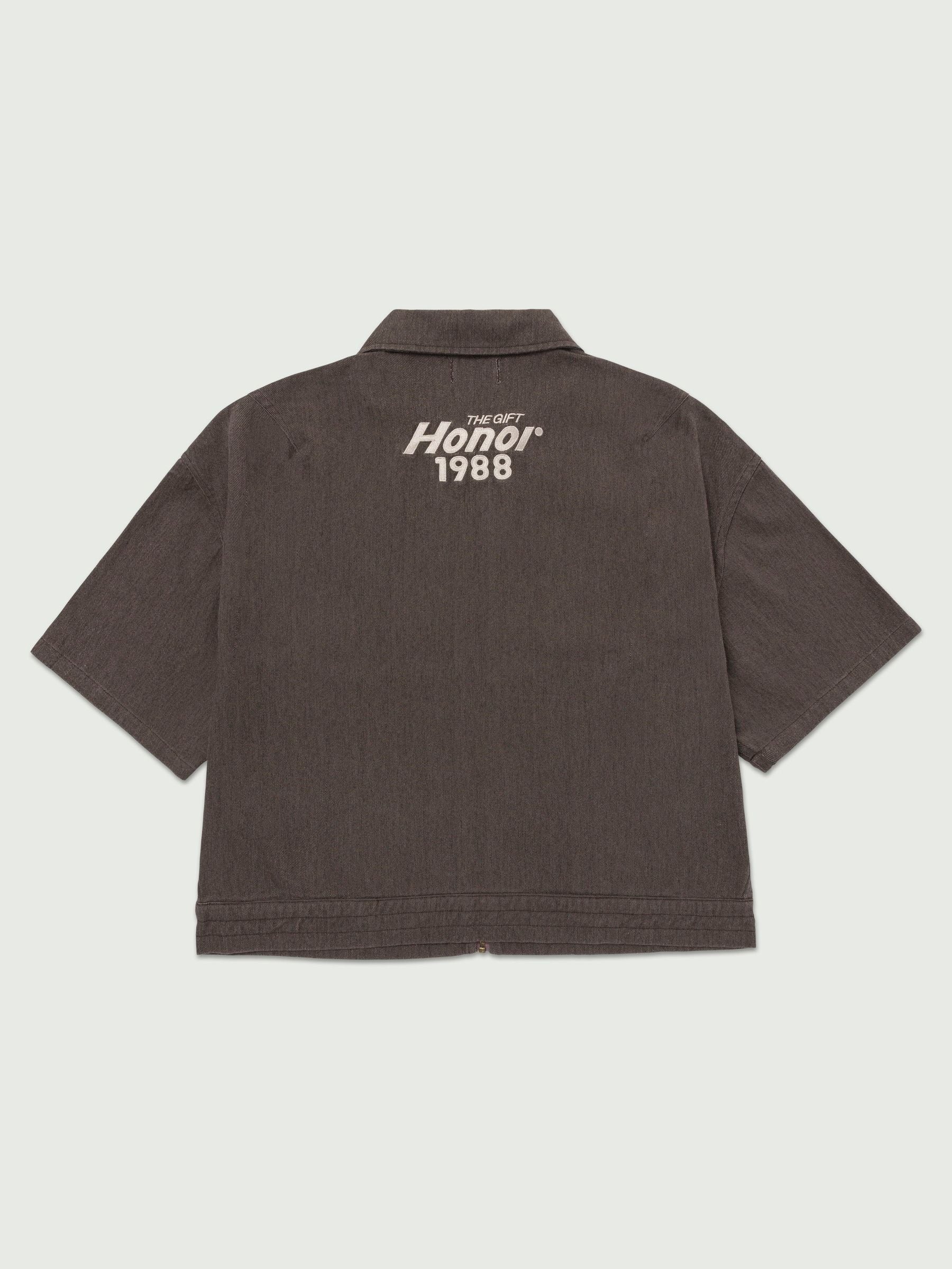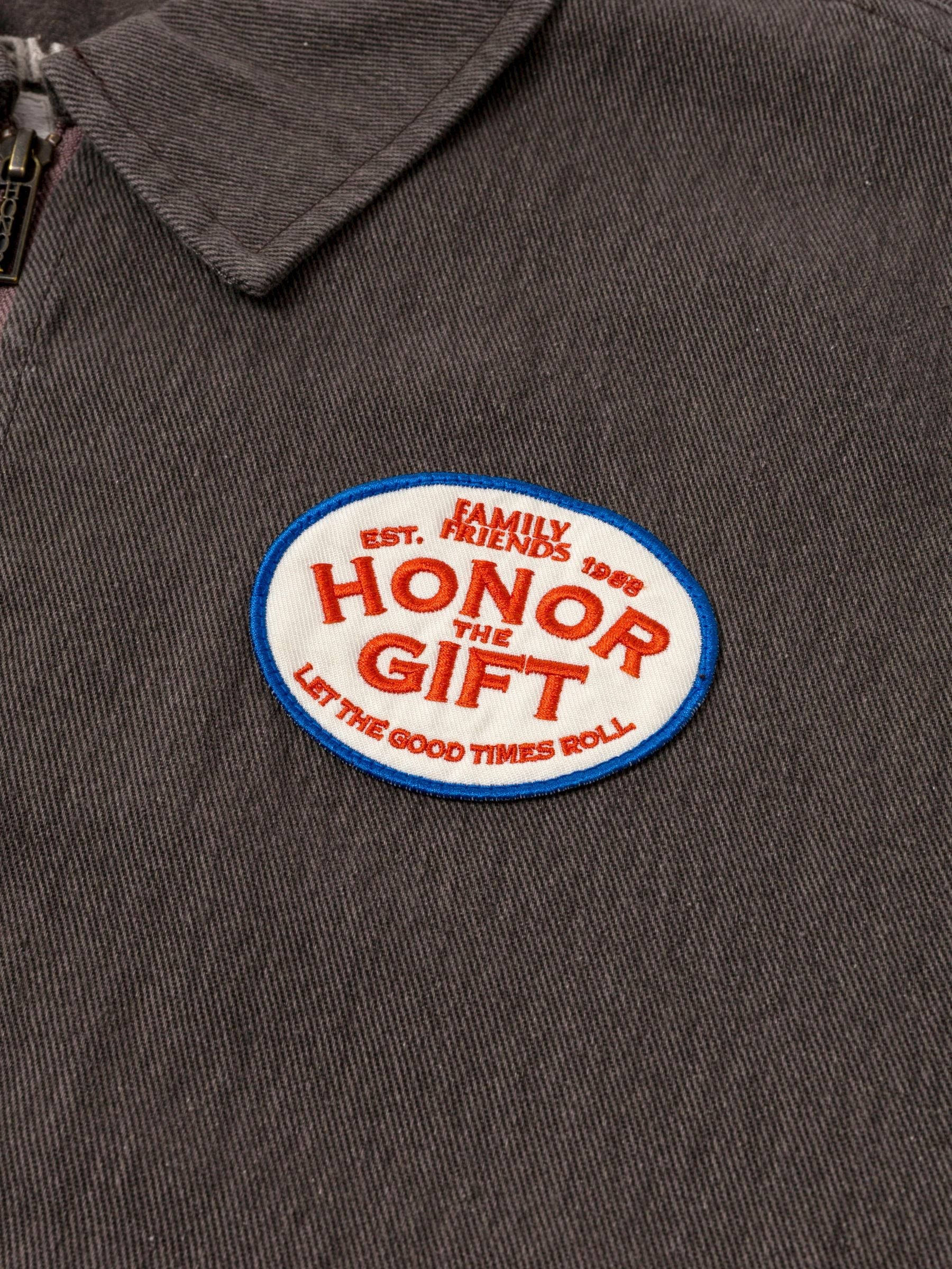 The Honor The Gift Twill Full Zip Shirt combines classic style with modern details. Crafted from 100% cotton twill, this black short-sleeve shirt offers durability and comfort. Its full zip design allows for easy layering, while distinctive Block Party patches add a unique, refined touch. Ideal for those seeking a versatile, expertly tailored piece that stands out with subtle sophistication.