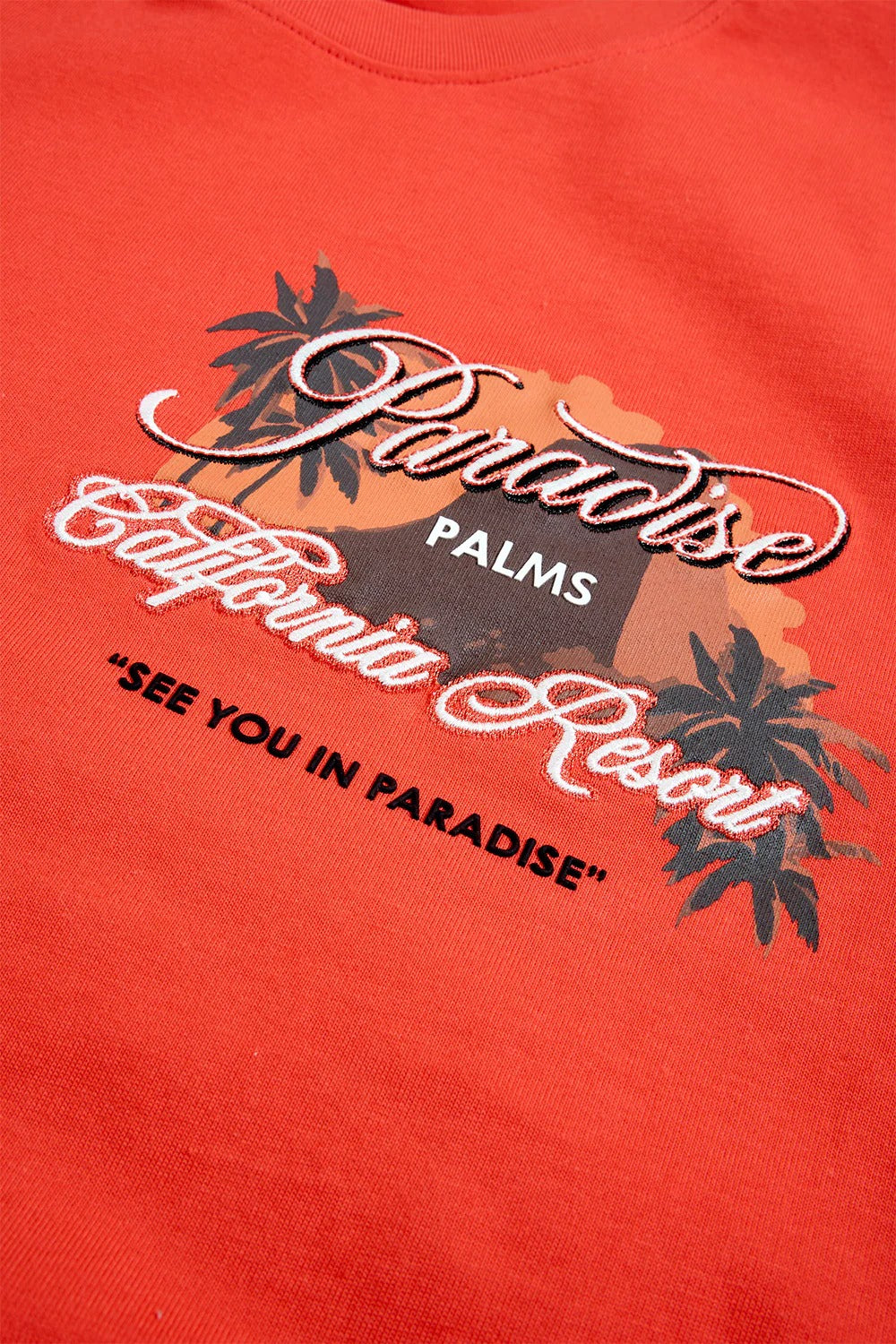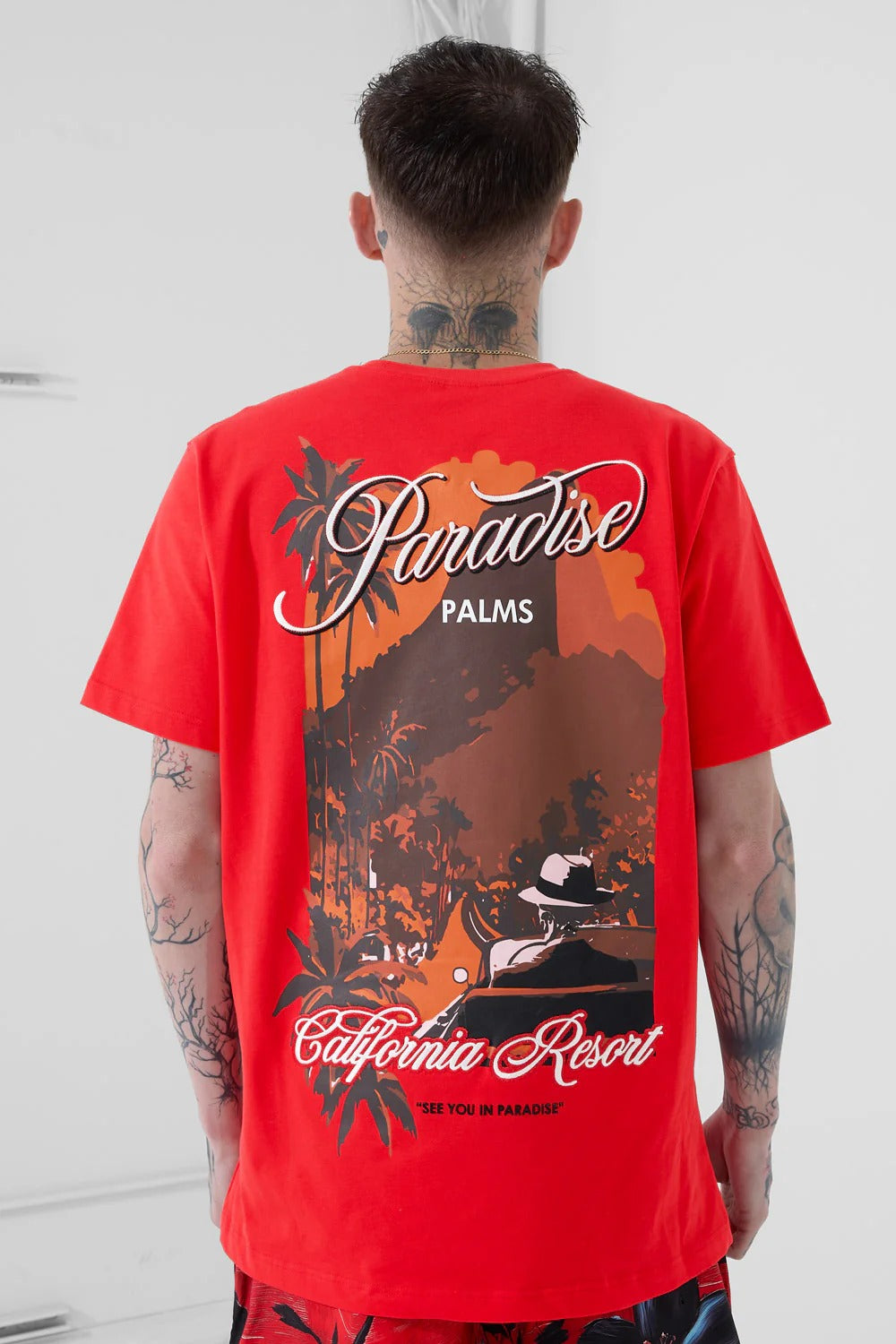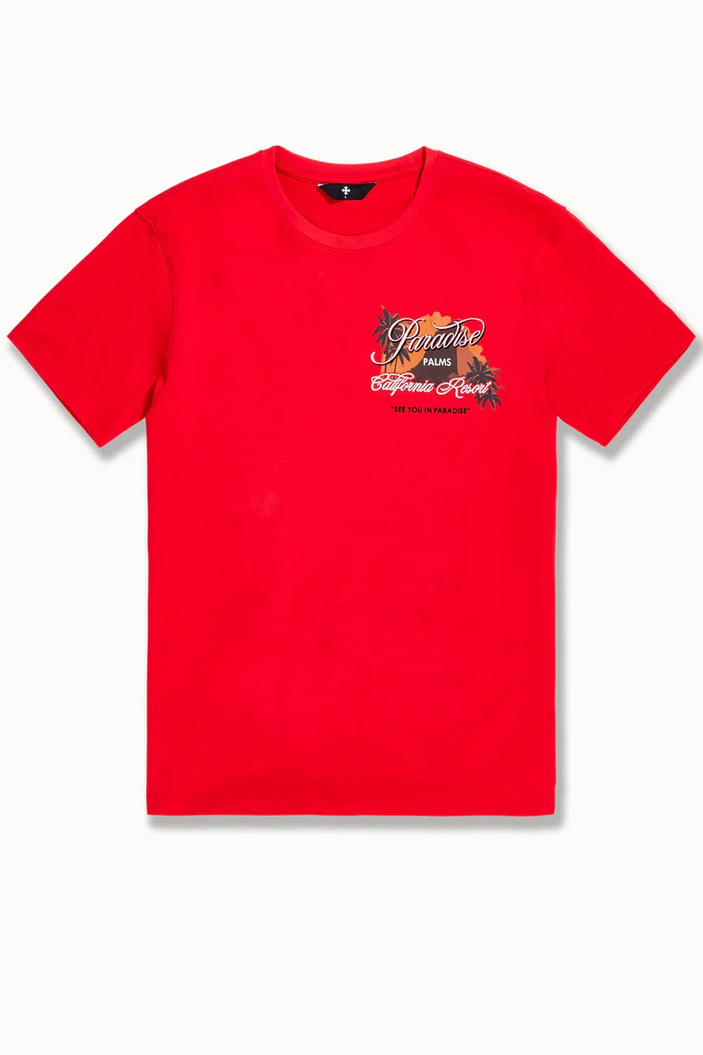Rock the Jordan Craig "See You In Paradise" tee with bold front and back graphics that make an instant impression. This men's short sleeve shirt features a classic crew neckline and straight hem for a clean, flattering fit. Available in red and white, the Paradise Palms design brings tropical vibes to your everyday rotation. Comfortable enough for all-day wear, it's the perfect addition to your casual collection.