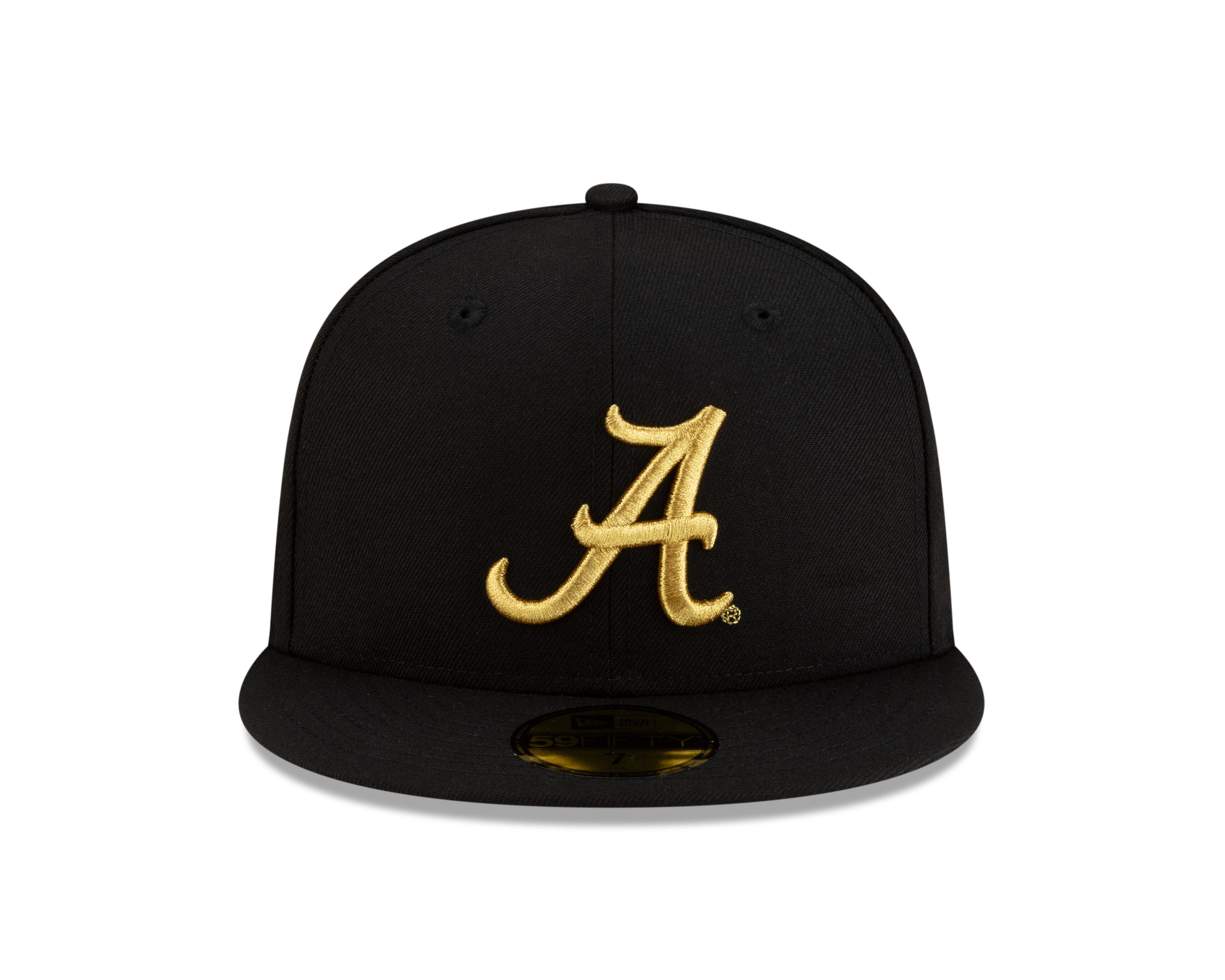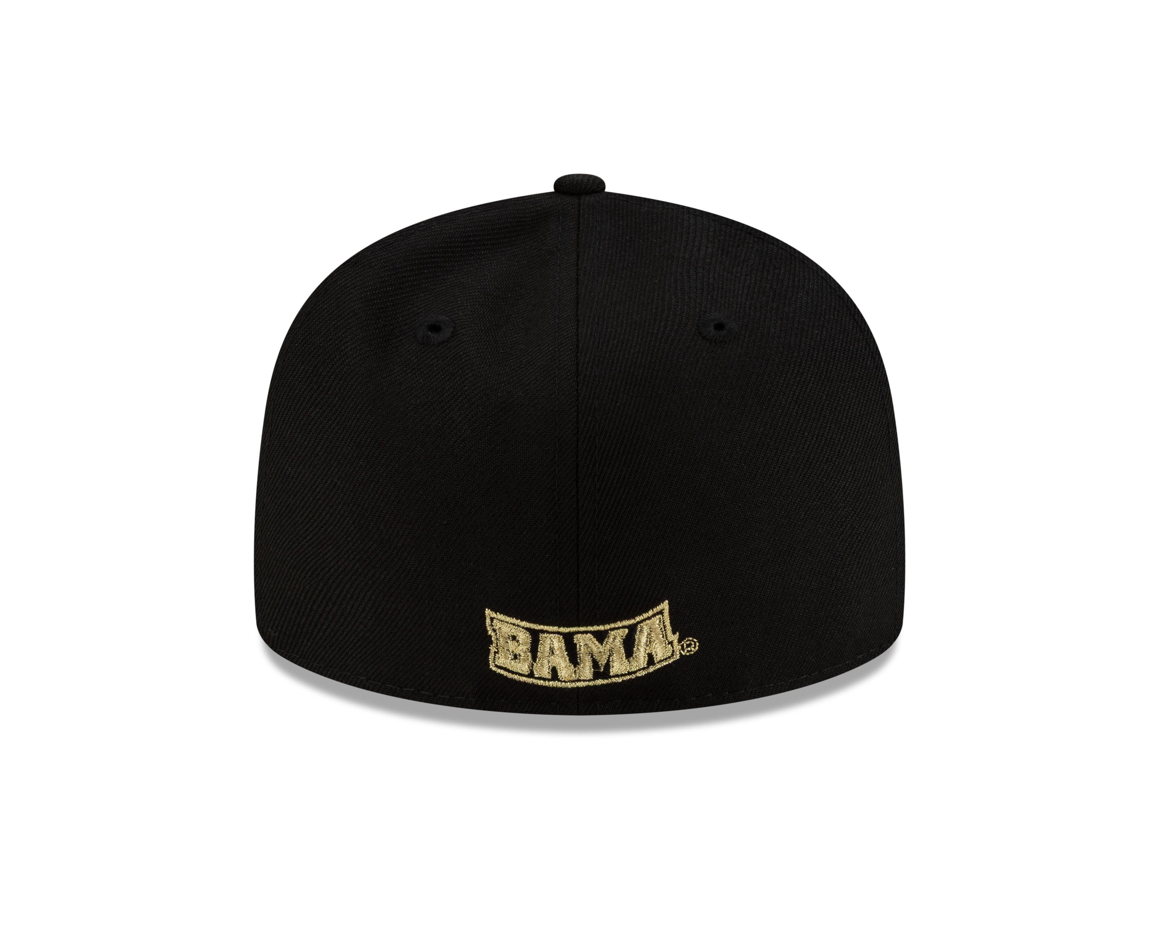 This New Era 59/50 men's fitted hat showcases the Alabama Crimson Tide in classic black with refined gold accents. Featuring a gold Alabama "A" logo on the front and "Bama" embroidered in gold on the back, its sleek design is completed with a black button on top and a grey undervisor for added contrast. Precision-crafted for a comfortable fit, this cap delivers both team pride and expert style in one premium accessory.