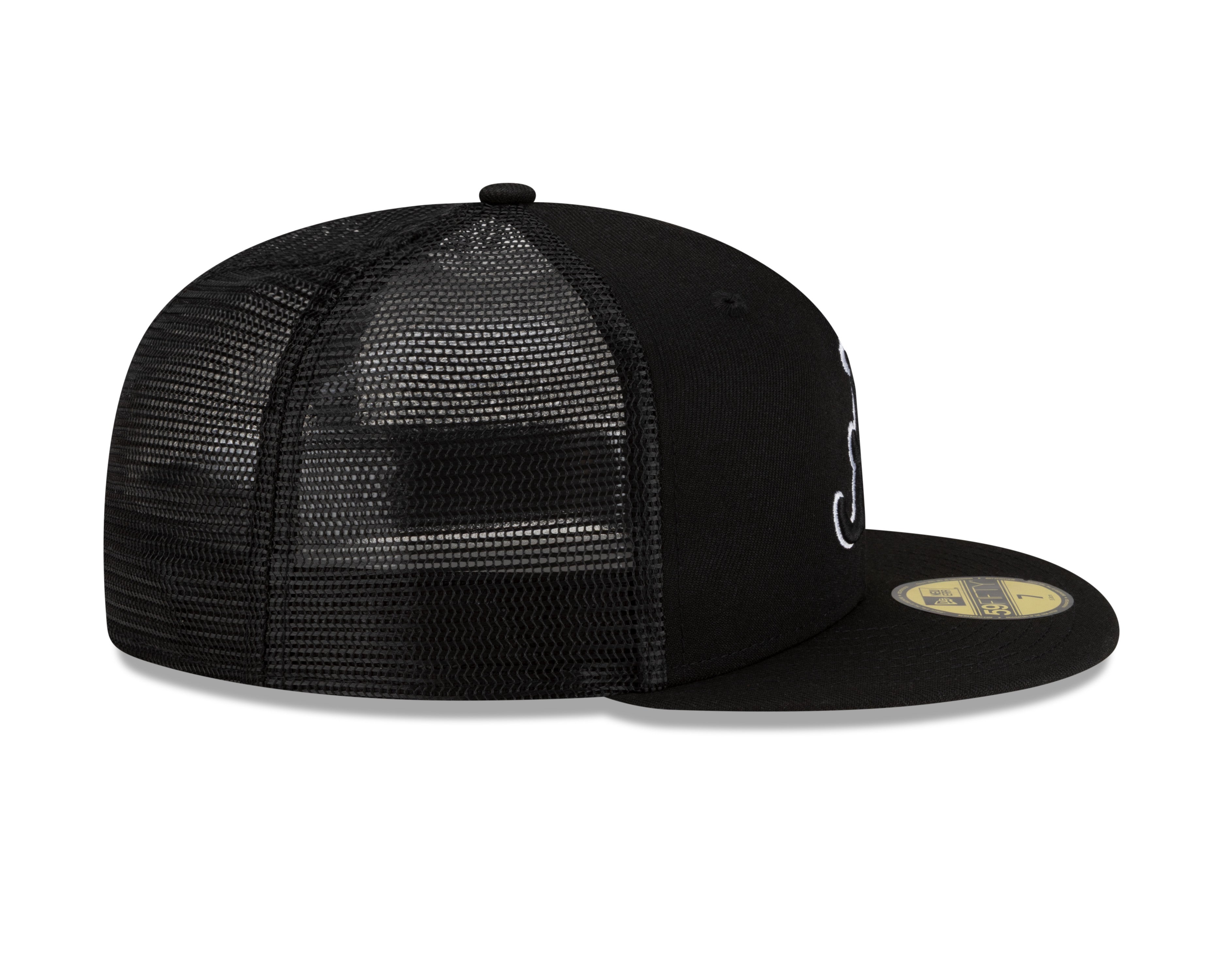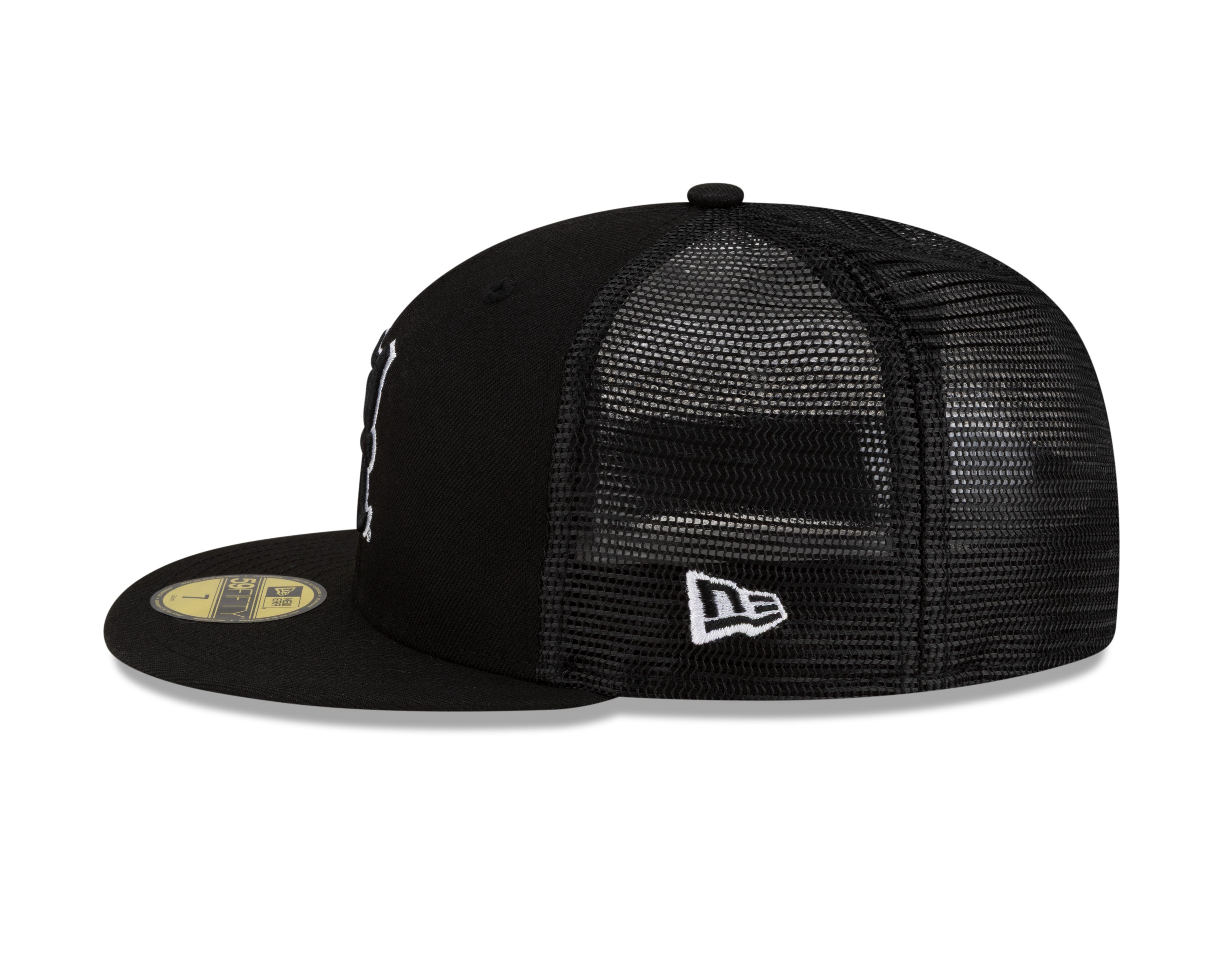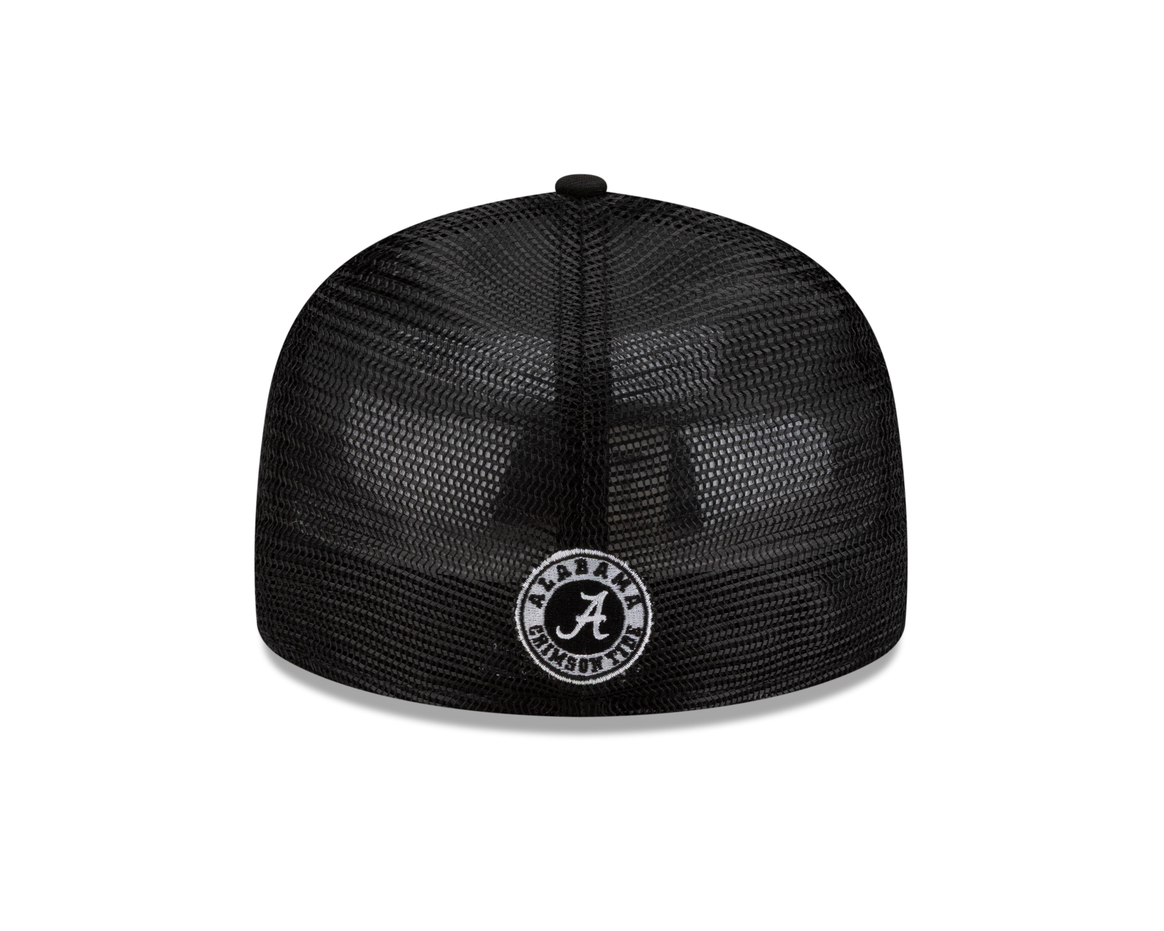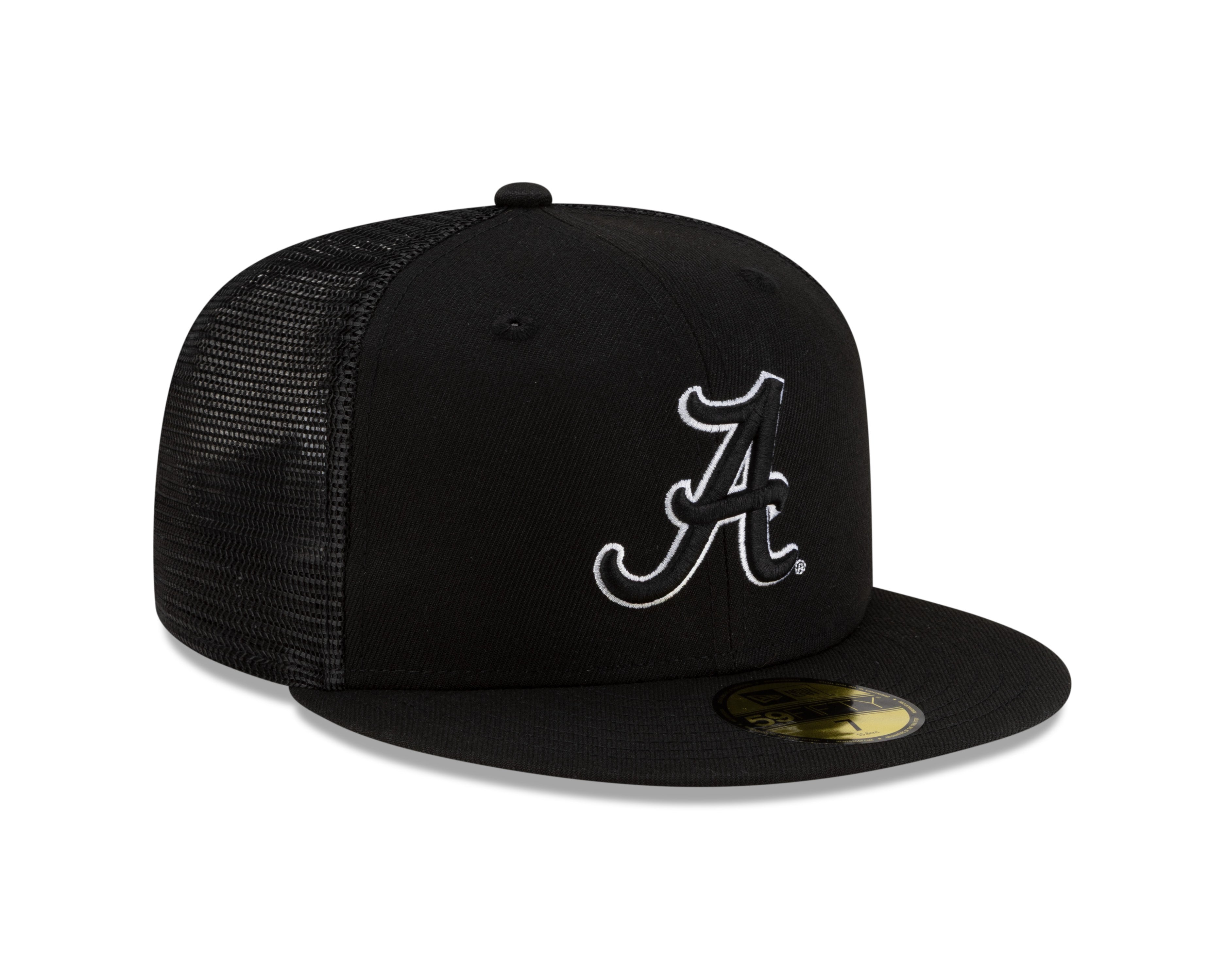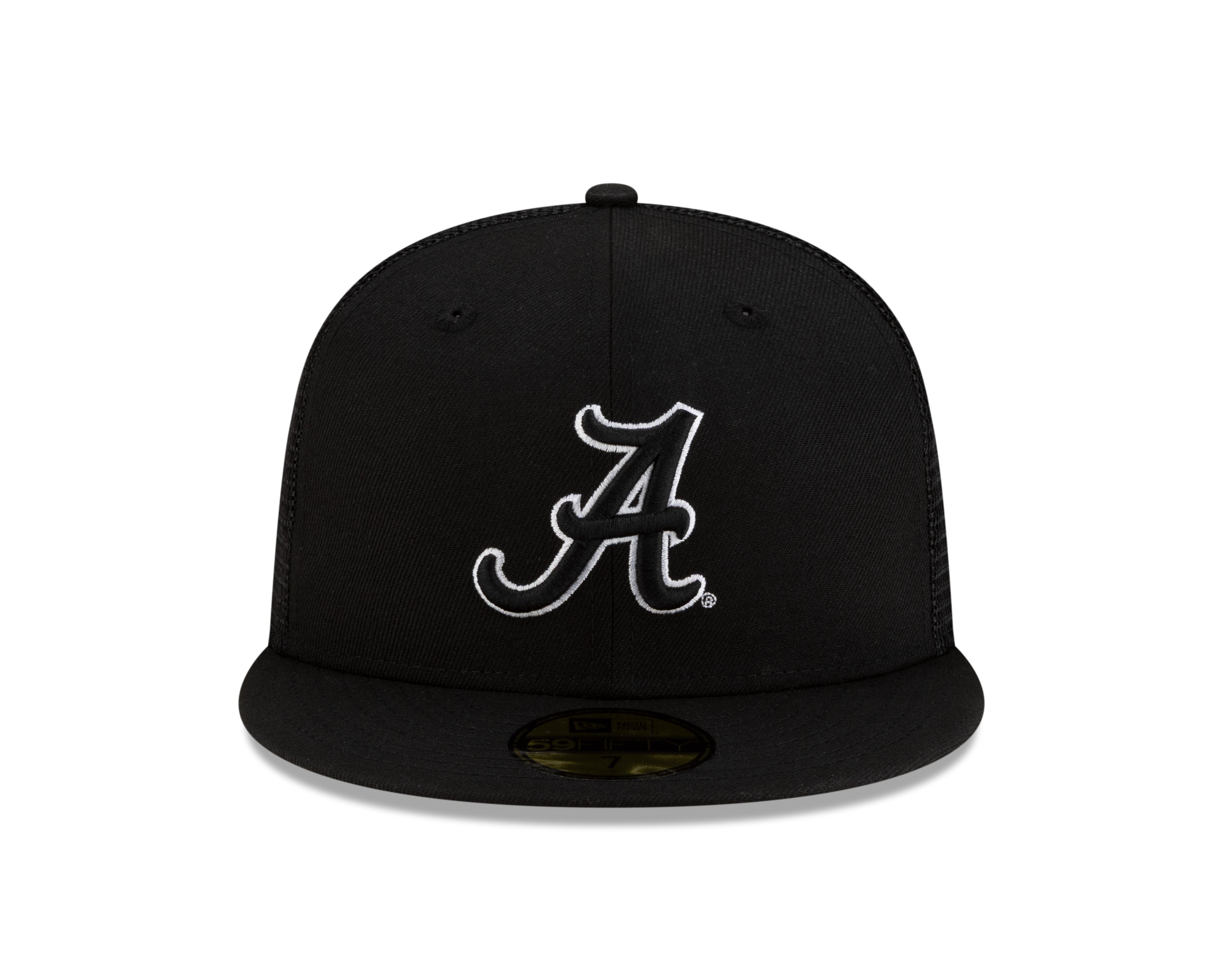 This New Era 59/50 men's fitted trucker hat features the iconic Alabama Crimson Tide "A" logo outlined in white on a sleek black crown, paired with a matching black button top. Designed for a comfortable and secure fit, it includes a grey undervisor to reduce glare, blending style and function for fans seeking authentic team gear.