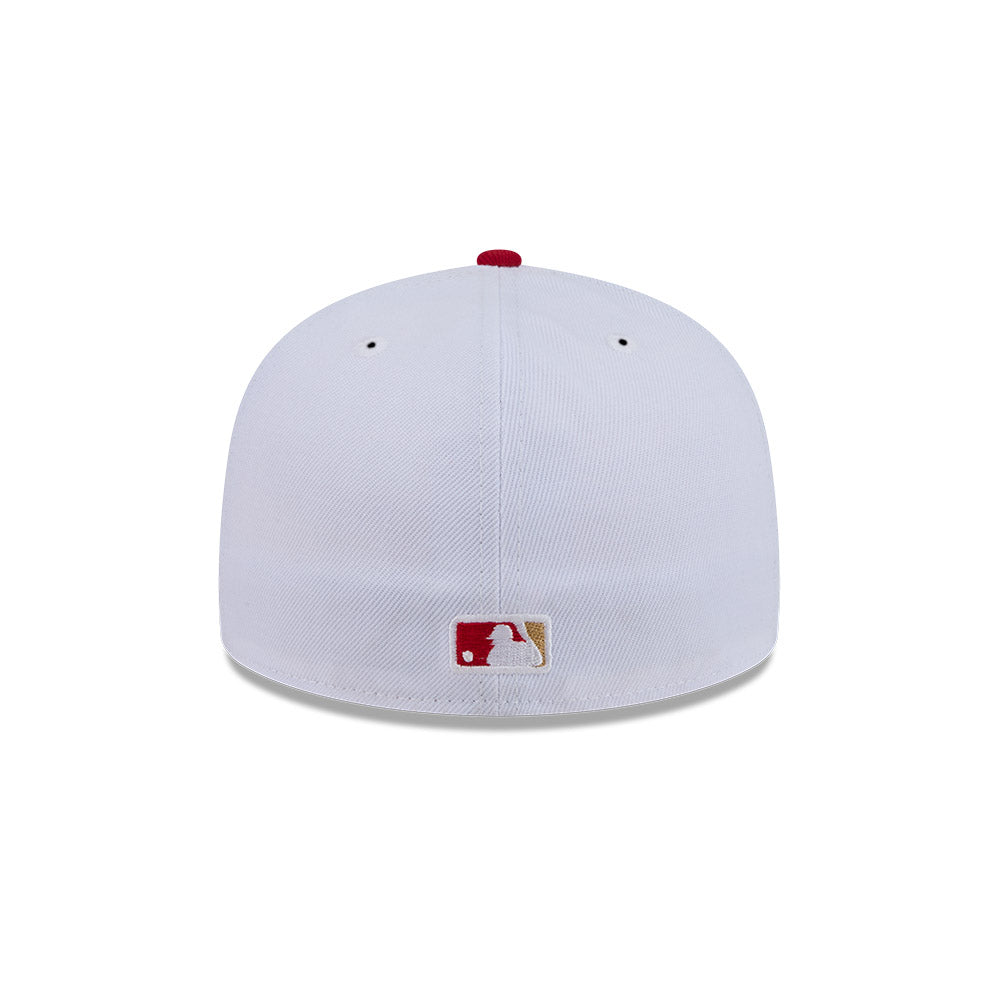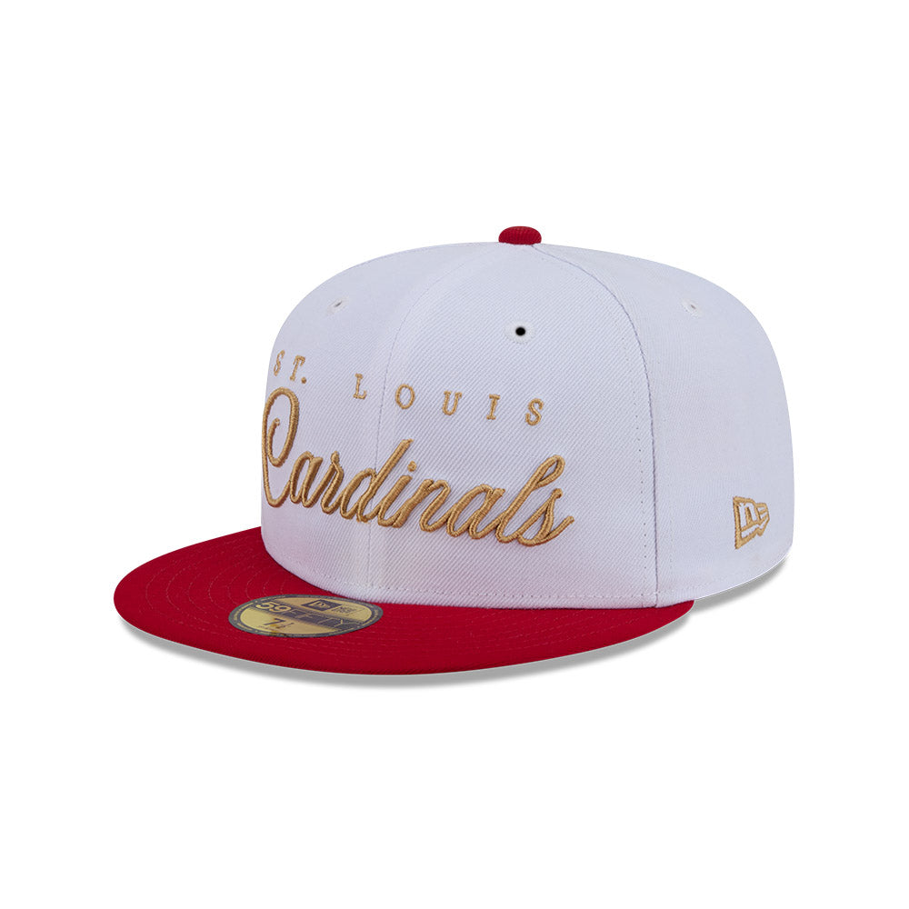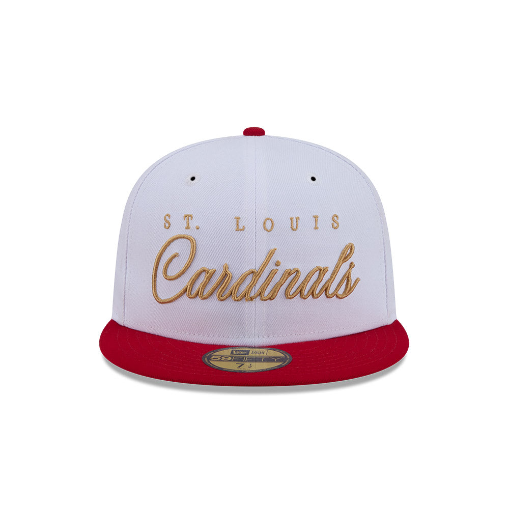 Step up your Cardinals pride with this classic New Era 59/50 fitted hat. Featuring crisp white and red colorway, the hat showcases gold scripted "St. Louis Cardinals" lettering across the front and the iconic cardinal logo on the side. The red button top and grey undervisor complete the authentic look. Perfect for game day or everyday wear, this structured fit delivers the timeless style Cardinals fans demand.