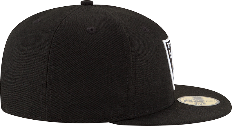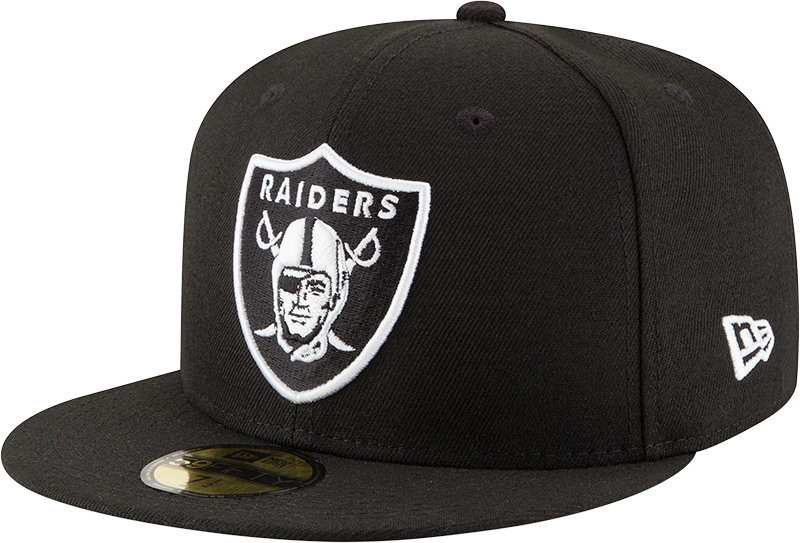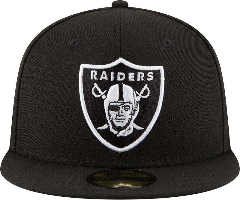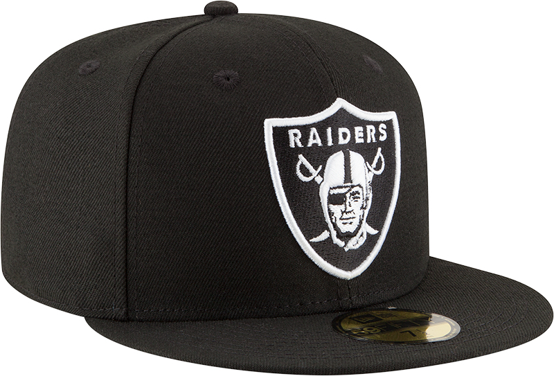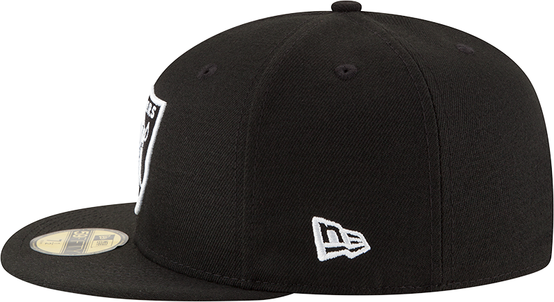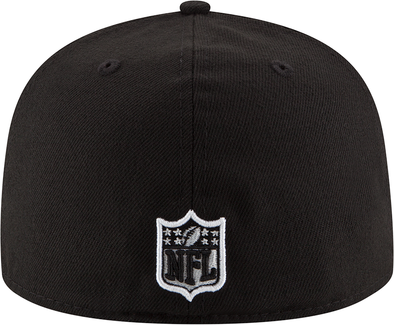 This New Era 59/50 fitted hat in black showcases the Oakland Raiders team emblem with a sleek black button atop. It features a subtle grey undervisor and an NFL patch elegantly placed on the back, combining classic style with refined detailing.