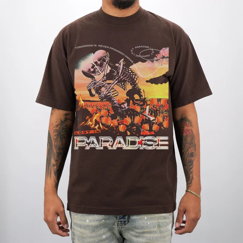 Elevate your casual wardrobe with the Paradise Lost Men's Short Sleeve Tee in Mocha. Featuring a refined crew neckline and a straight hem, this regular-fit shirt offers both comfort and style. The distinctive graphic on the front adds a subtle yet impactful statement, making it an ideal choice for those who appreciate understated sophistication. Perfect for everyday wear, this tee blends classic design with modern appeal.
