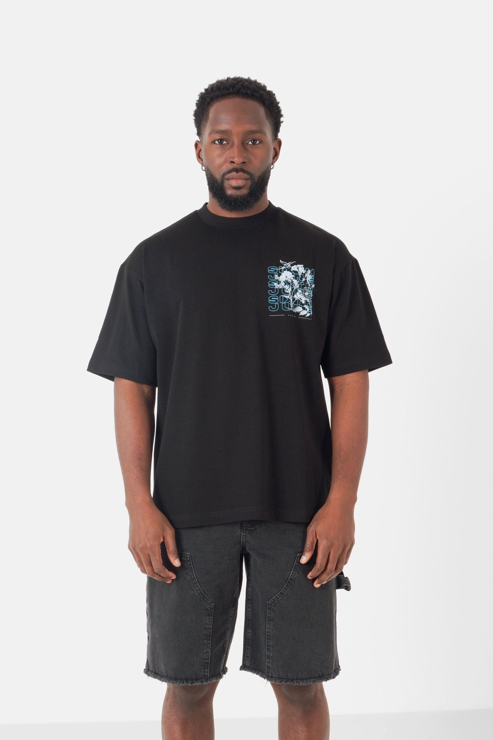 This Sixth June men's short sleeve tee features a sleek black design with crew neckline for a comfortable fit. Its standout element is the distinctive Flower SJ Square graphic displayed on both the front and back, adding a modern edge. The straight hem ensures a clean silhouette, making it a versatile piece that blends contemporary style with everyday wearability. Perfect for those seeking subtle yet impactful streetwear.