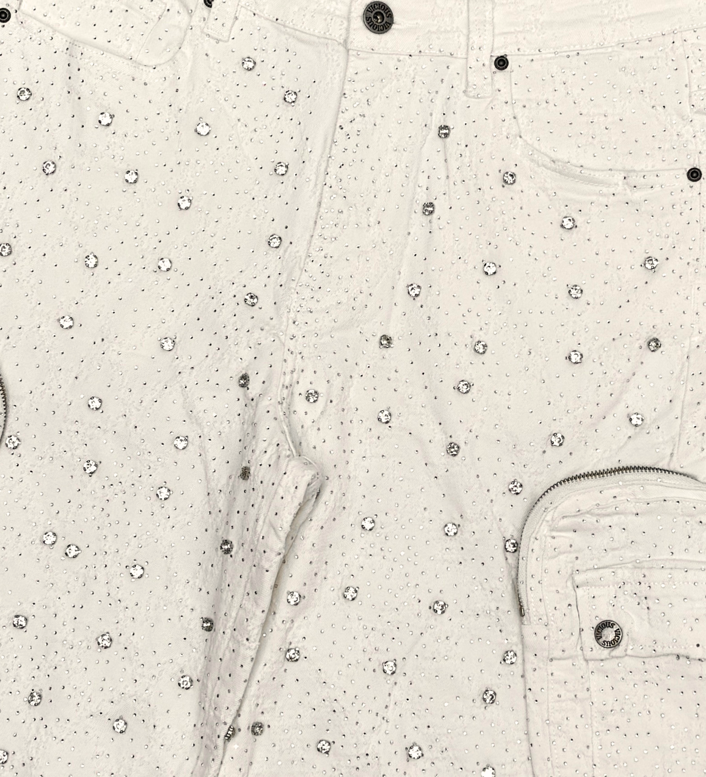 Elevate your casual style with the Vicious Denim Shorts in Off White. These shorts feature a classic five-pocket design and belt loops for a tailored fit, enhanced by shimmering rhinestones that add a subtle yet striking sparkle. Perfect for warm weather, they offer a refined way to make a bold, polished statement.